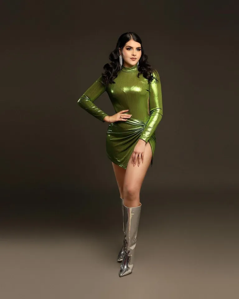 A metallic green mini with silver boots? Yes, this is how you enter a new age like you’re stepping out of a sci-fi runway show. The high-shine fabric hugs perfectly while the structured draping adds dimension that catches every light in the room.