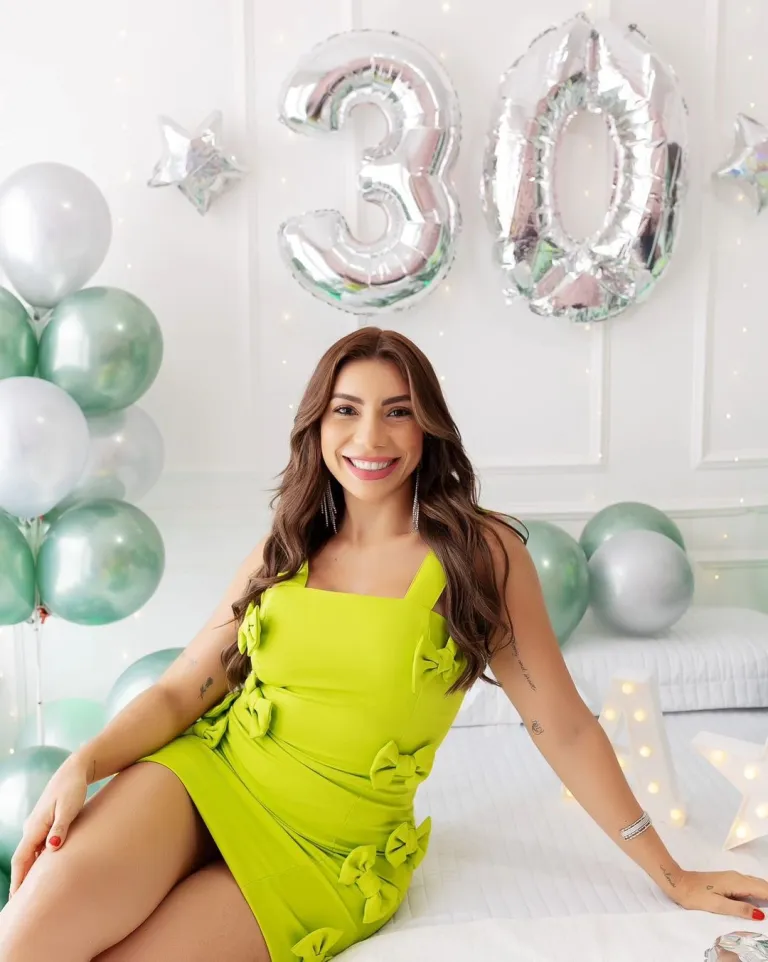 Turning 30 never looked this chic. The white one-shoulder dress keeps it classy, while the pink balloons and cake add the perfect celebratory vibe. It’s a timeless setup with just enough sparkle to feel special.