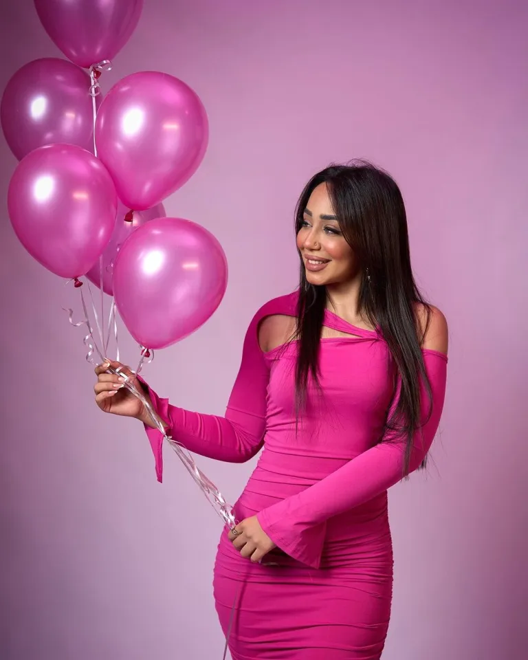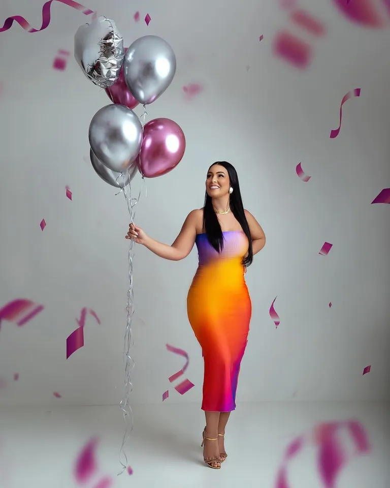 This hot-pink cut-out dress is pure birthday-girl energy. The sleek silhouette, the bold color, the glossy balloons — everything is giving “I walked in, and yes, it’s my day.” It’s that perfect mix of playful and glam that makes photos look effortless.
