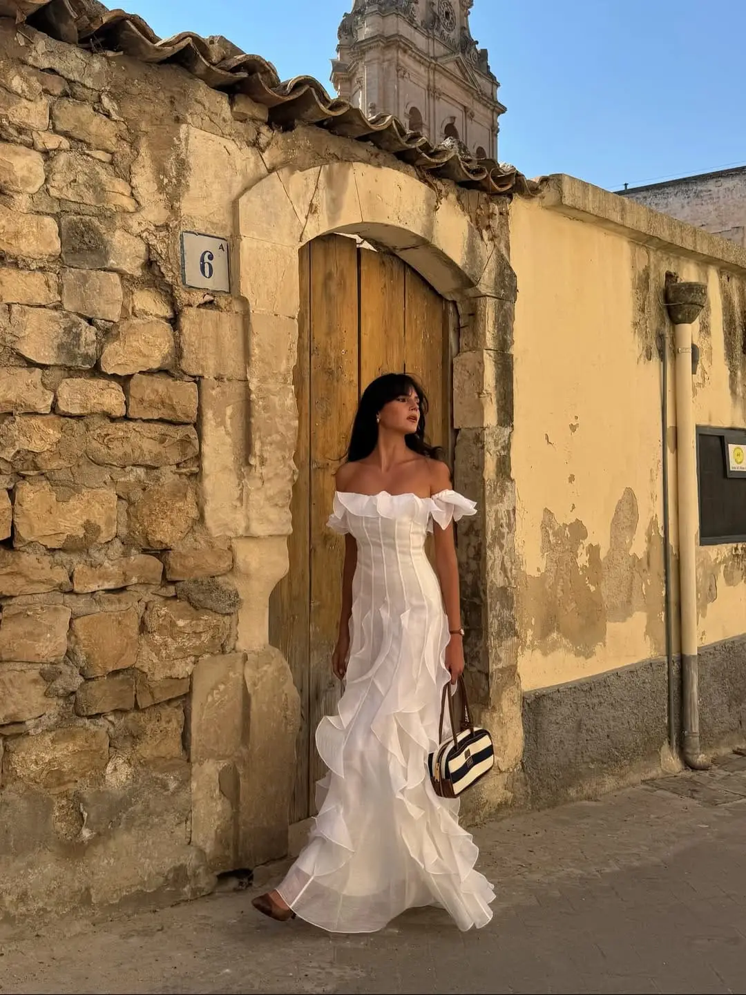 This off-shoulder white gown feels straight out of an Italian summer story — ruffled, romantic, and impossibly chic. The structured bodice keeps it polished, while the cascading tiers add movement that looks stunning in photos.