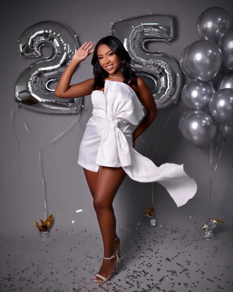 This crisp white romper dress delivers elegance with a twist — literally, thanks to that sculptural bow. Paired with silver balloons and glowing lighting, it creates a luxe birthday aesthetic that stands out instantly.