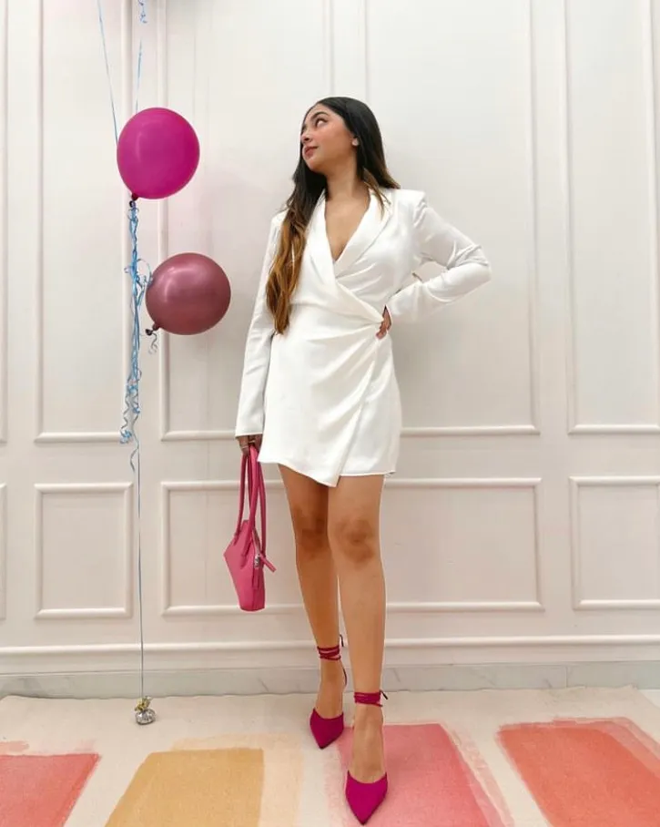White satin + clean lines + hot pink accessories? Chef’s kiss. This blazer-style mini dress is elegant without even trying, and the pop of pink keeps it playful and party-ready. It’s classy birthday glam with a twist of “I know exactly what I’m doing.”
