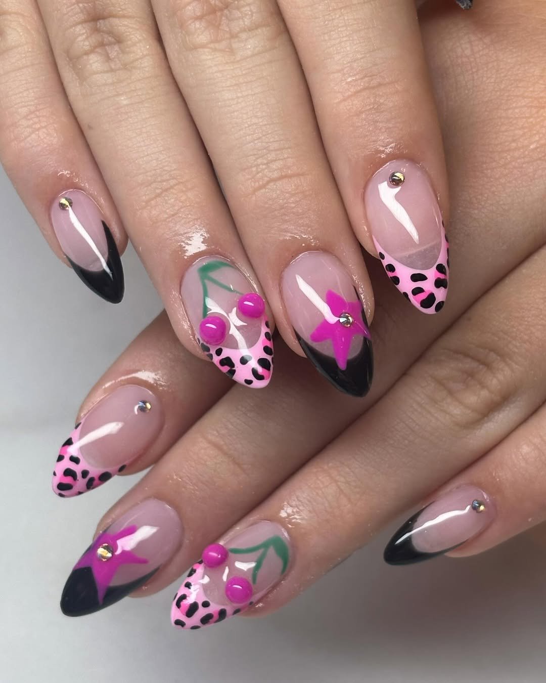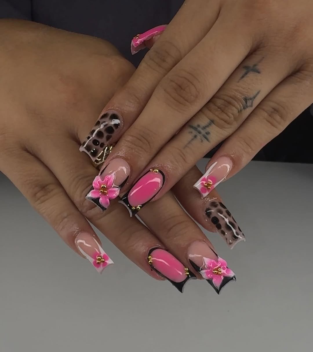This set is doing the most in the best way — soft pink bases, playful leopard accents, and those little floral pops that instantly steal the spotlight. It’s girly, bold, and surprisingly balanced all at once.