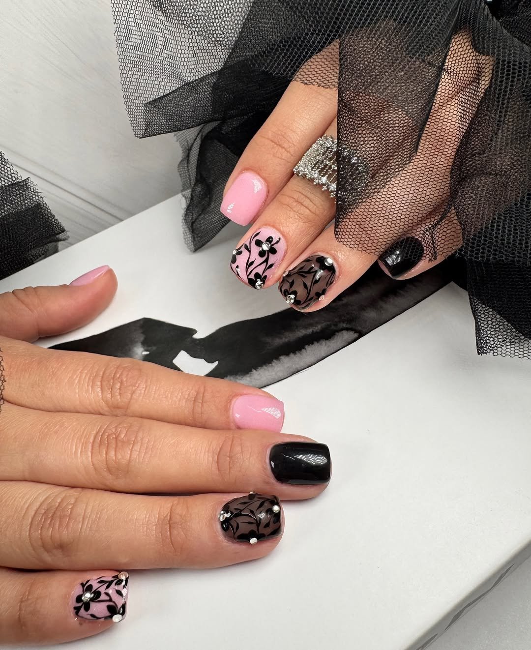 This shorter set proves you don’t need length for drama. Baby pink and glossy black florals paired with tiny gems create a look that’s sweet, polished, and quietly elegant.