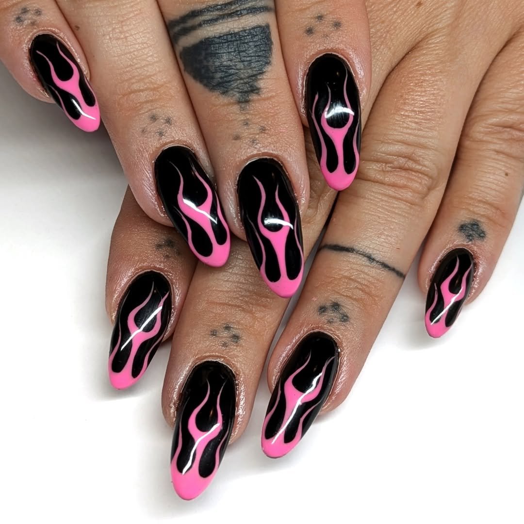 Classic black flames melting into vibrant pink tips? Always a yes. This set keeps things sleek with almond shapes and glossy finishes that make those flames pop even more.