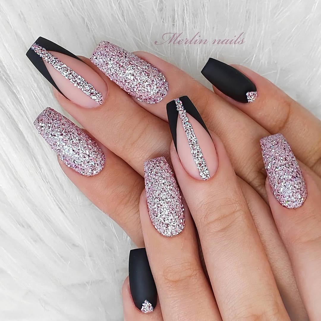 Ending strong with this glitter-packed stunner. Pink sparkle meets sharp black tips for a look that feels ultra-glam but still clean and structured.