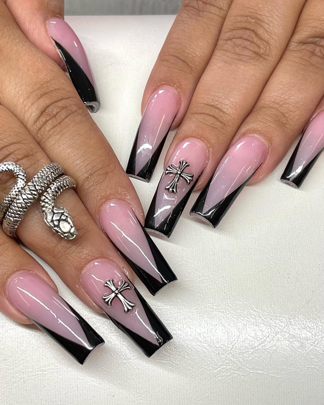 Soft pink bases meet sharp black tips and silver cross charms for a look that’s equal parts romantic and dark-core chic.