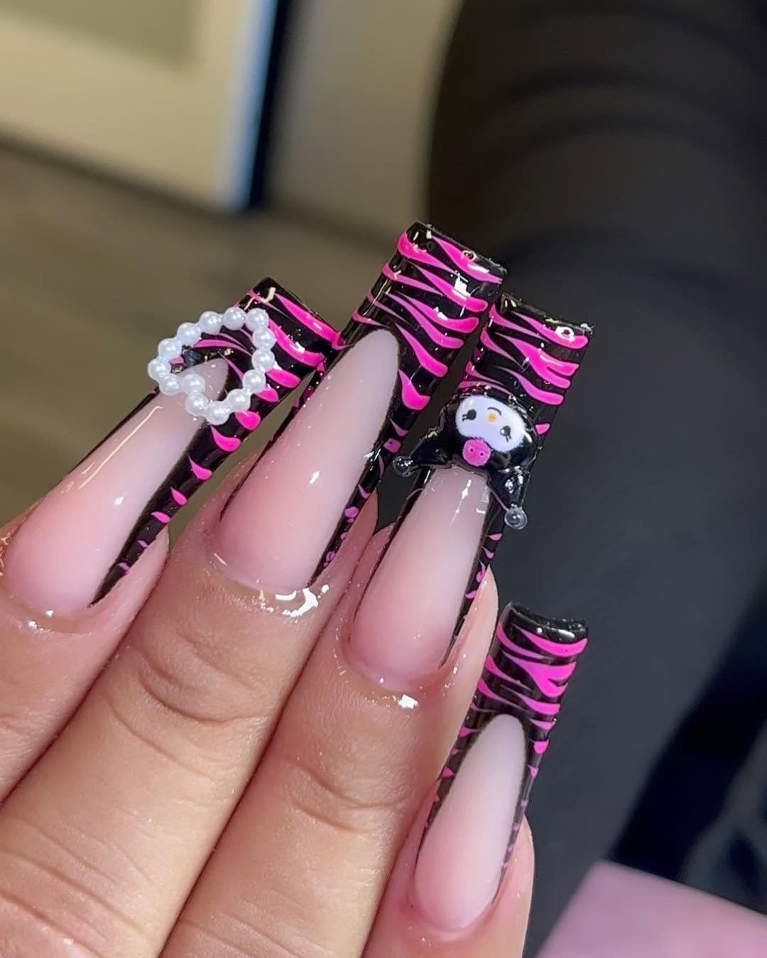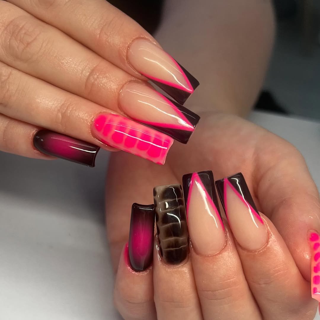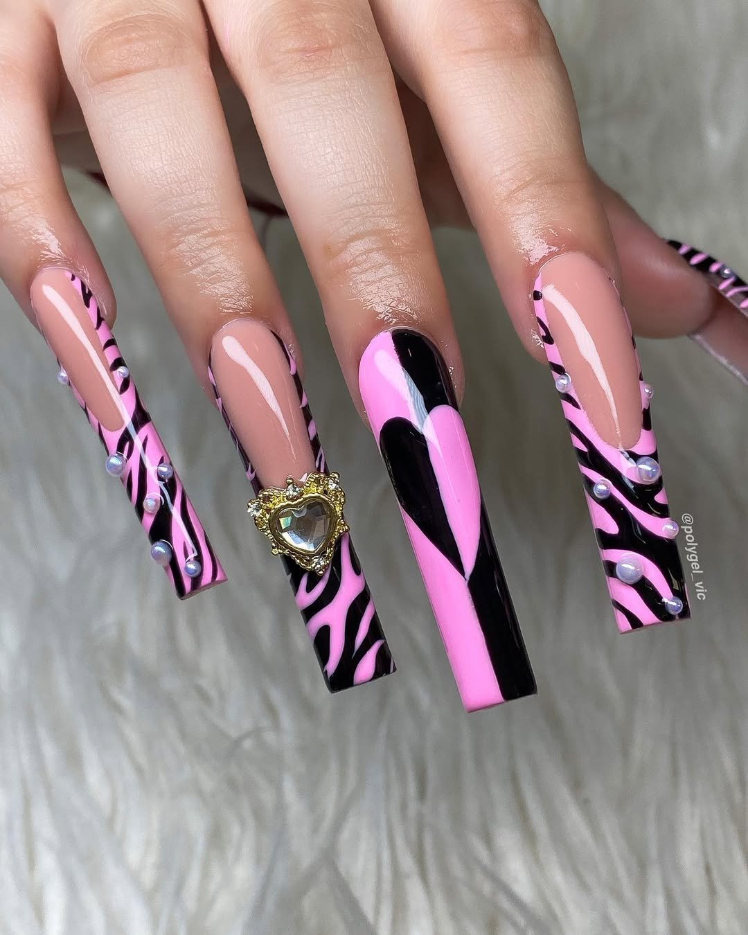 These long coffin nails are pure main-character energy. The neon pink and black zebra waves are striking on their own, but that heart charm? That’s the mic drop.