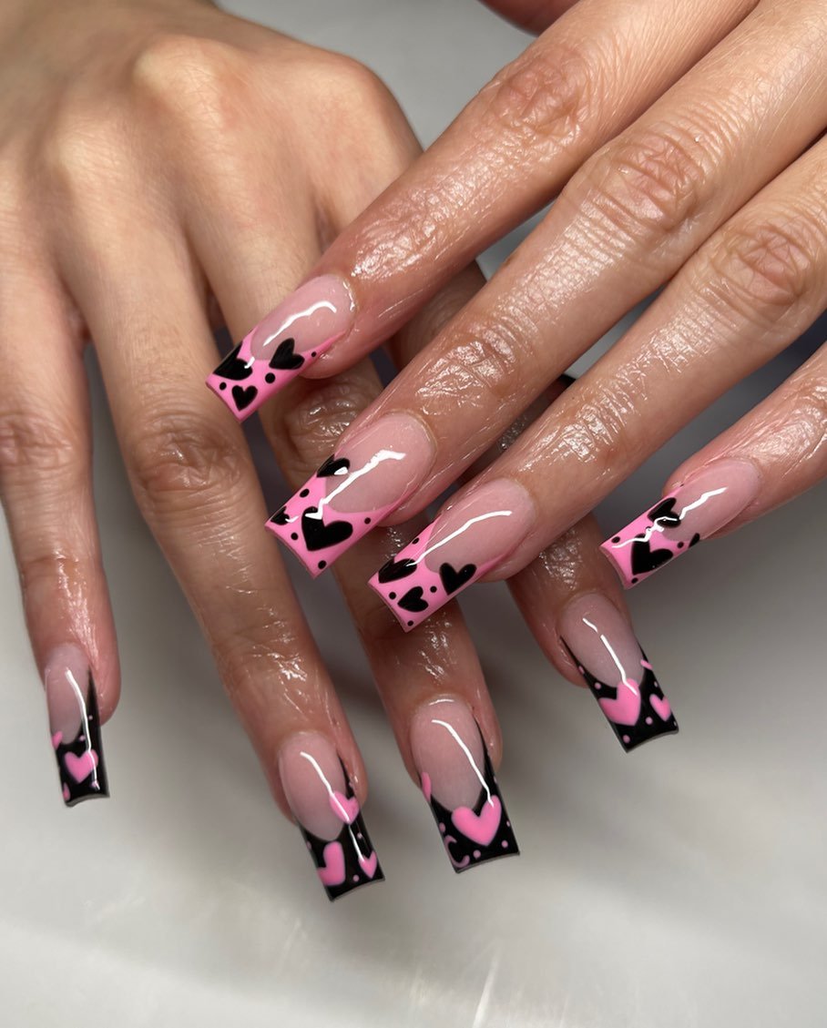 Soft pink bases with black French tips and tiny heart details? This is sweet-meets-sassy in nail form. Clean, glossy, and super wearable while still feeling special.
