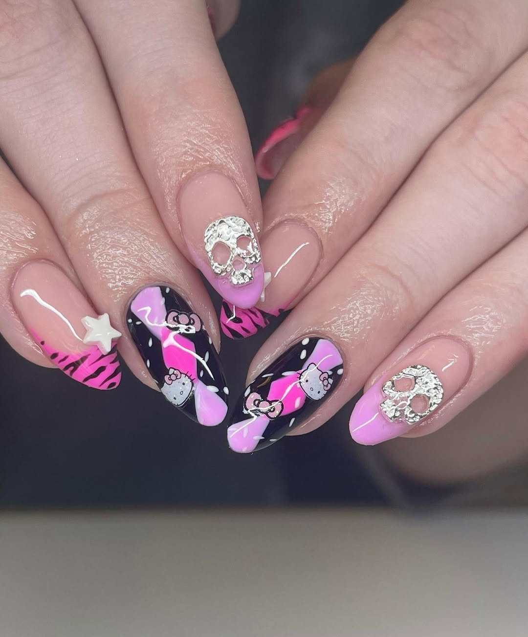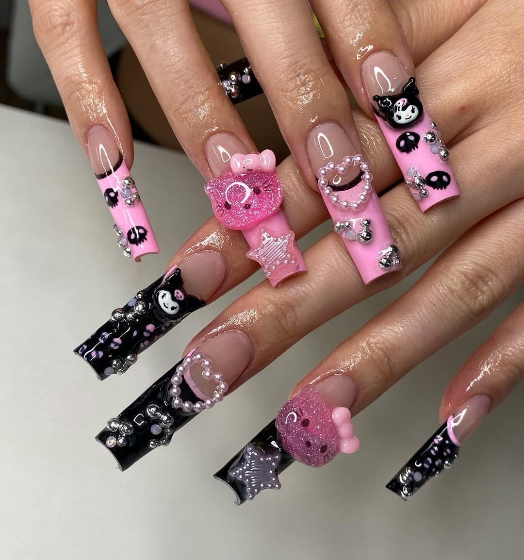 These nails are pure Y2K fantasy — pink flames, black accents, tiny characters, and even skull details living happily together. It’s maximalist, fun, and unapologetically loud.