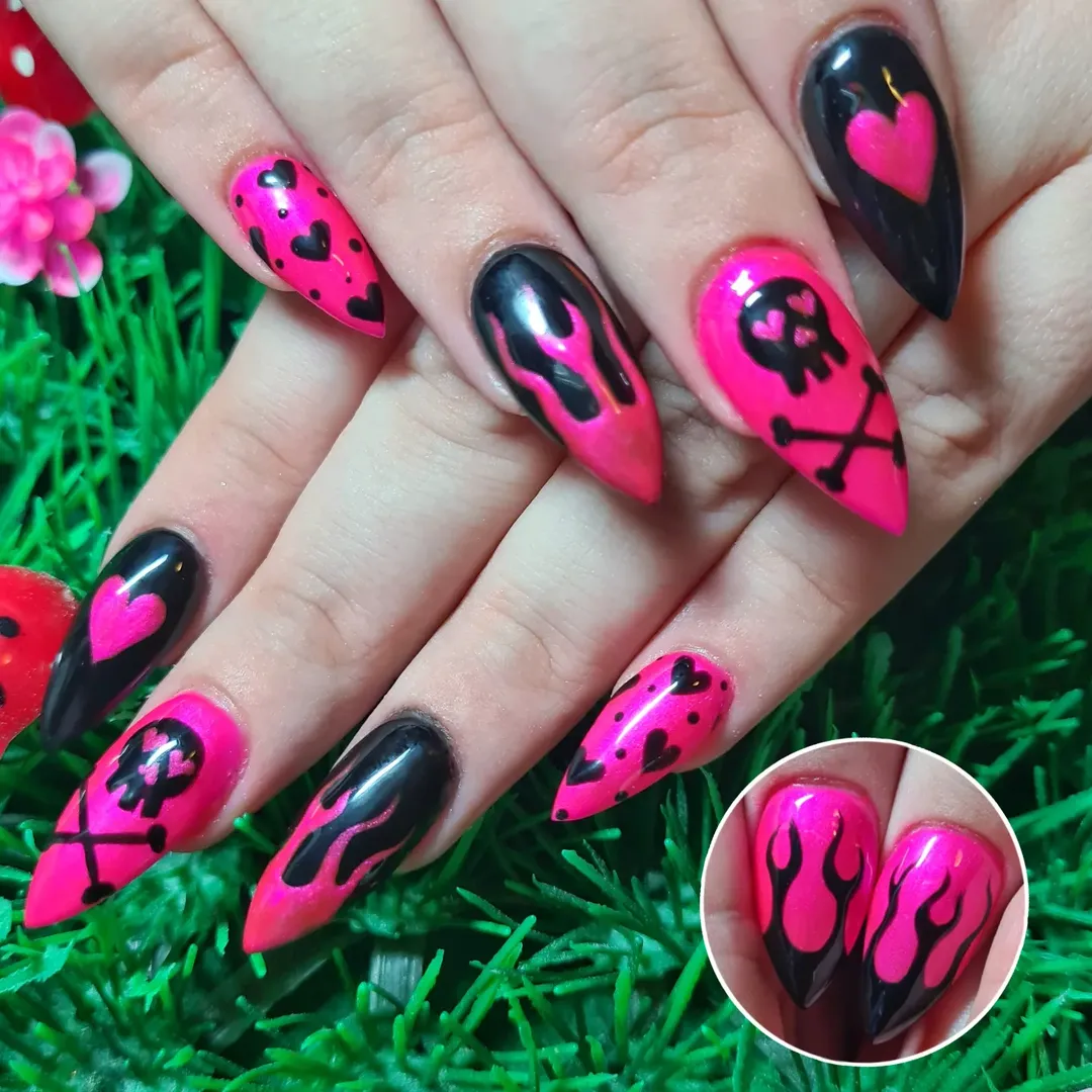 Bright pink flames, black skulls, heart accents — this set is loud in the best way. It’s fearless, fun, and totally built for anyone who lives for statement nails.