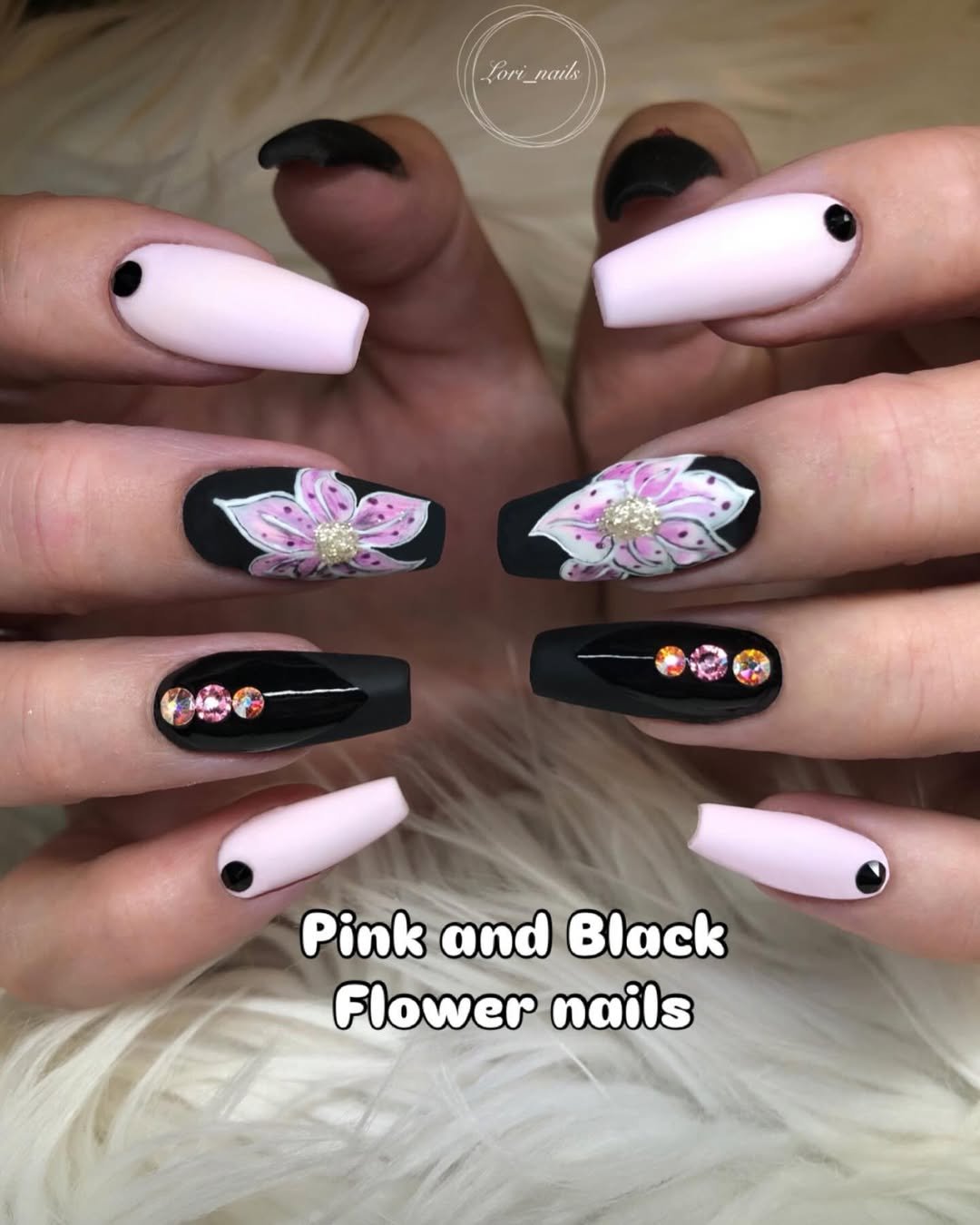 Matte black paired with baby pink and hand-painted florals? This one feels soft and dramatic at the same time. The crystal centers add just the right amount of sparkle.