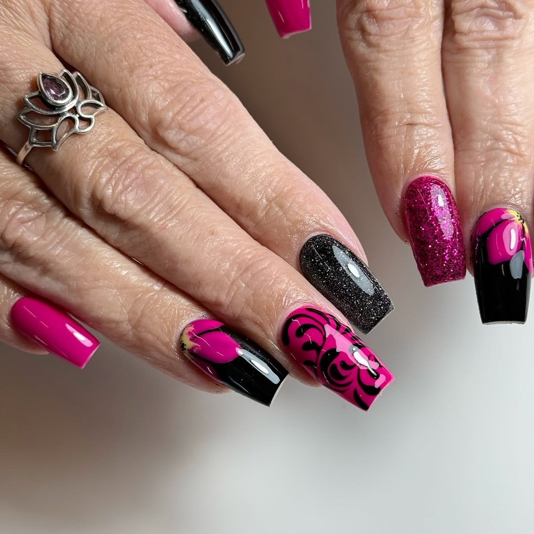 This combo of solid pink, black glitter, and floral accents feels powerful and playful all at once. Each nail brings something different, yet the whole look stays cohesive.