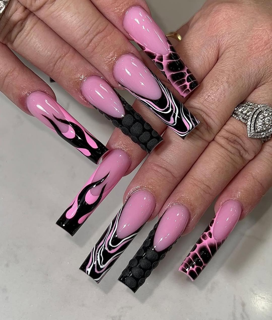 This set is all about contrast — smooth blush pinks paired with edgy black patterns and that unexpected textured accent nail.
