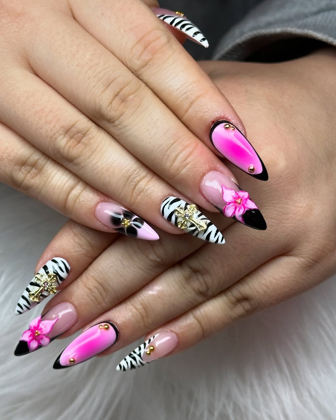 Okay, this one is for the bold girls. Between the zebra accents, glossy pink fades, and little gold details, every nail tells its own story — but somehow it all still works together.
