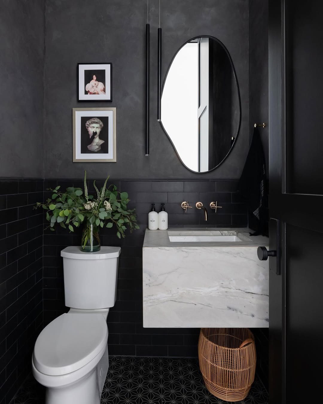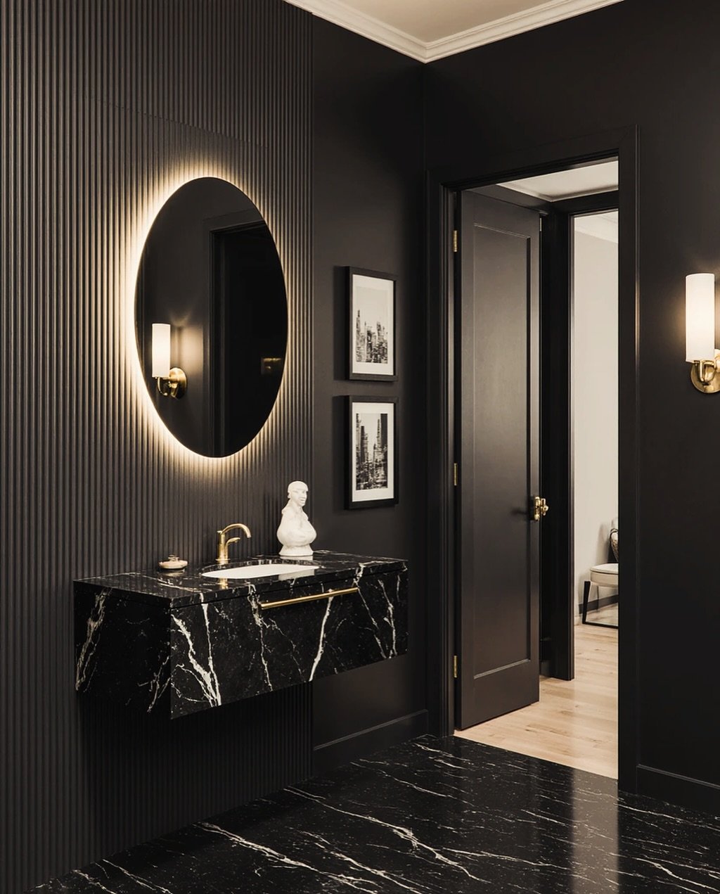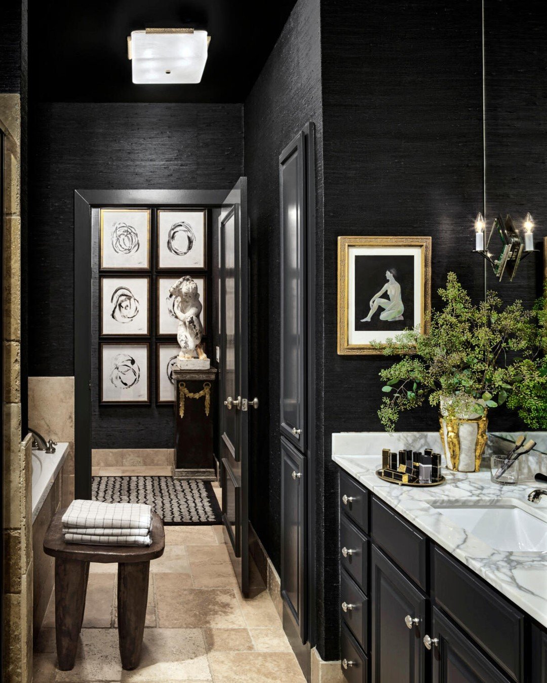 This one feels collected, almost like a private gallery tucked inside a home. Dark walls set the stage for framed art, sculptural accents, and a marble-topped vanity that anchors the space.