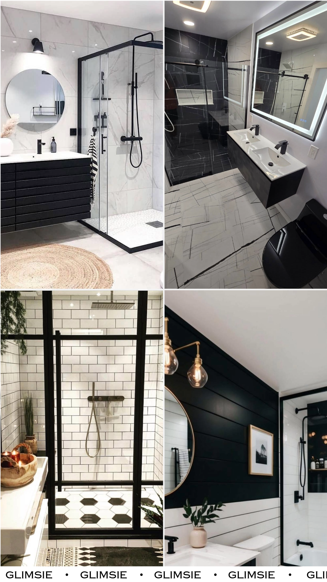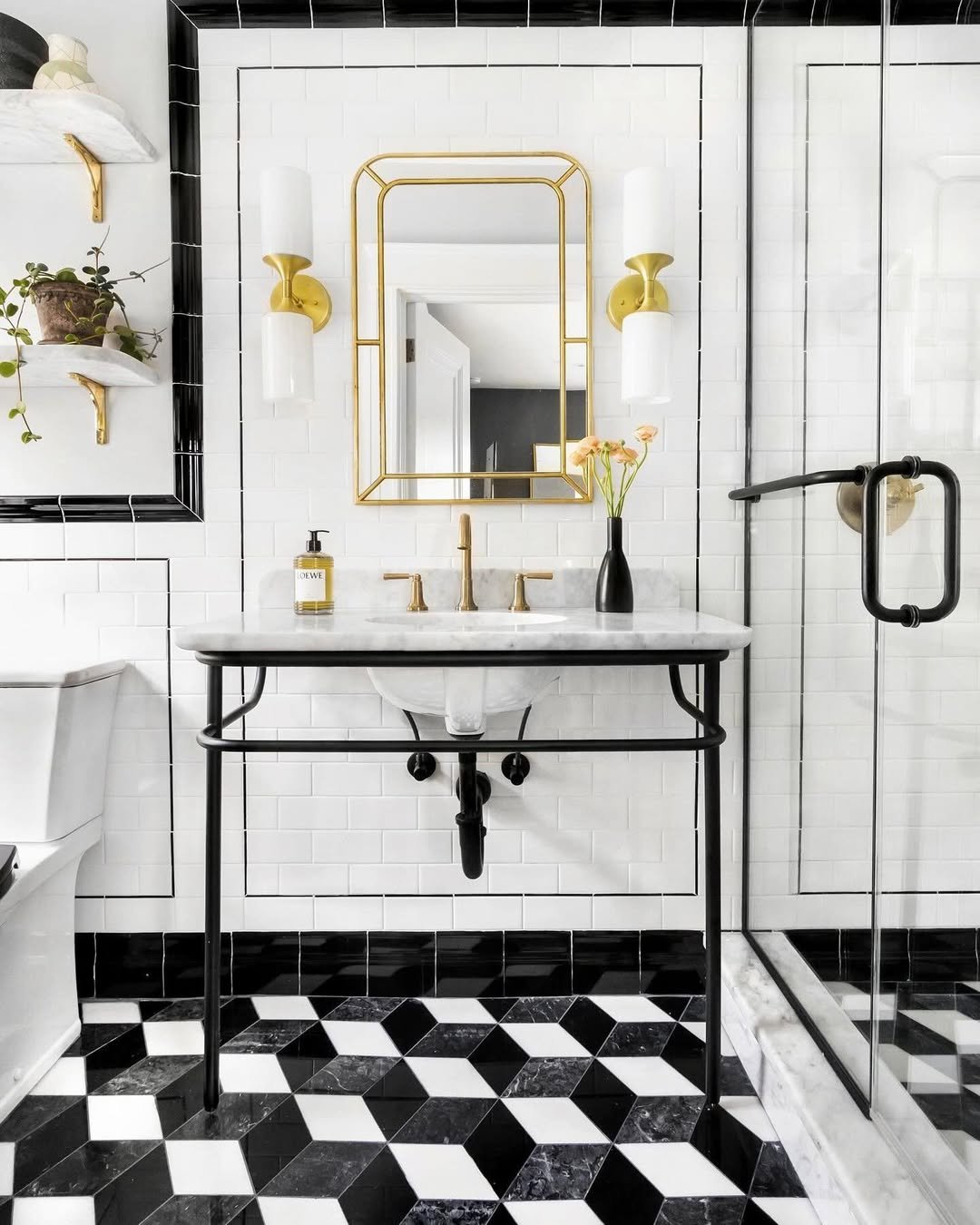 This one leans into contrast in the most playful way. The sharp black lines running through the white tile feel almost hand-drawn, giving the entire space an unexpected edge.