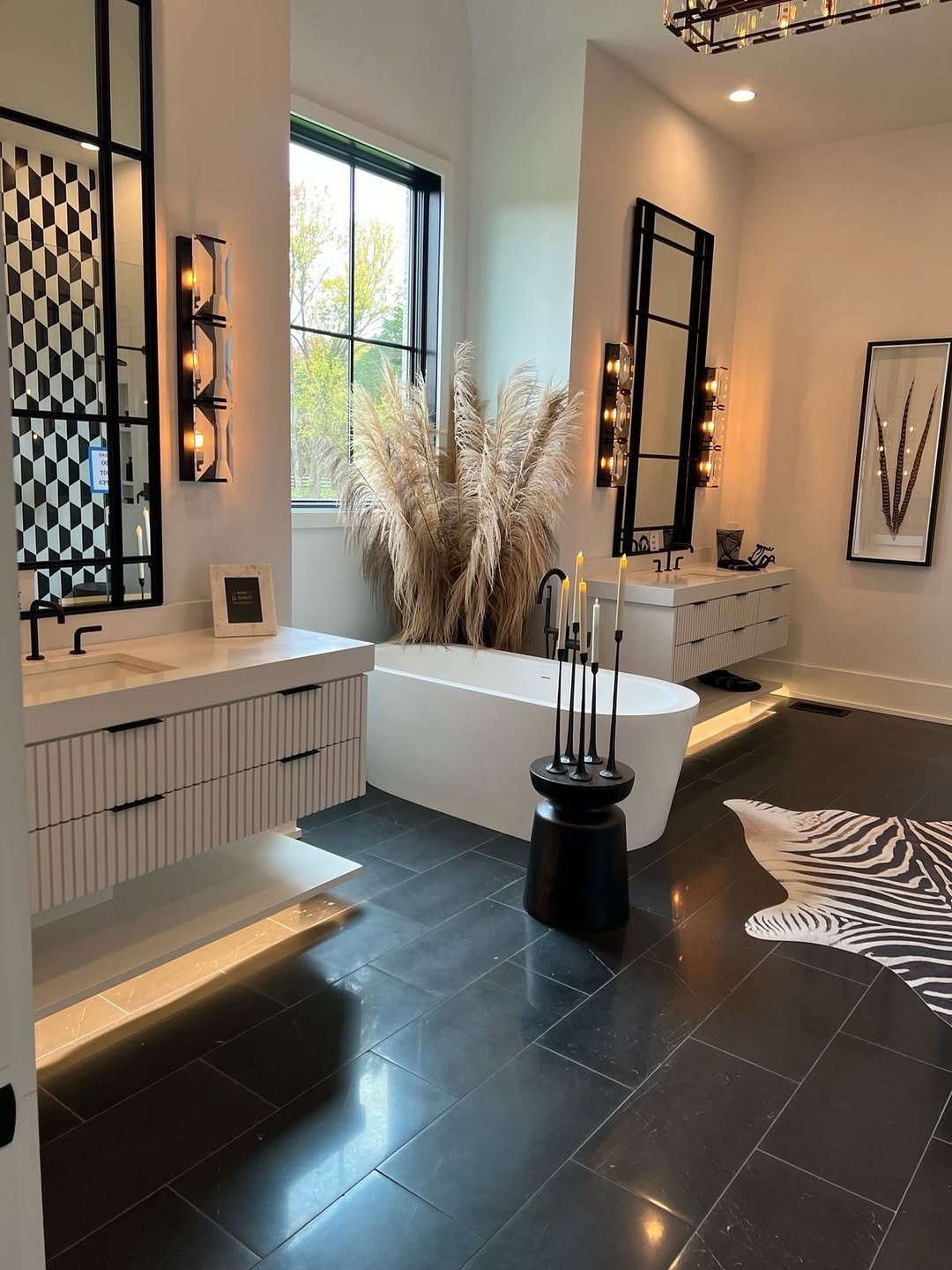 There’s something so satisfying about symmetry done right. Twin mirrors, twin sconces, and a grounded black vanity bring a sense of order that feels calm rather than rigid.