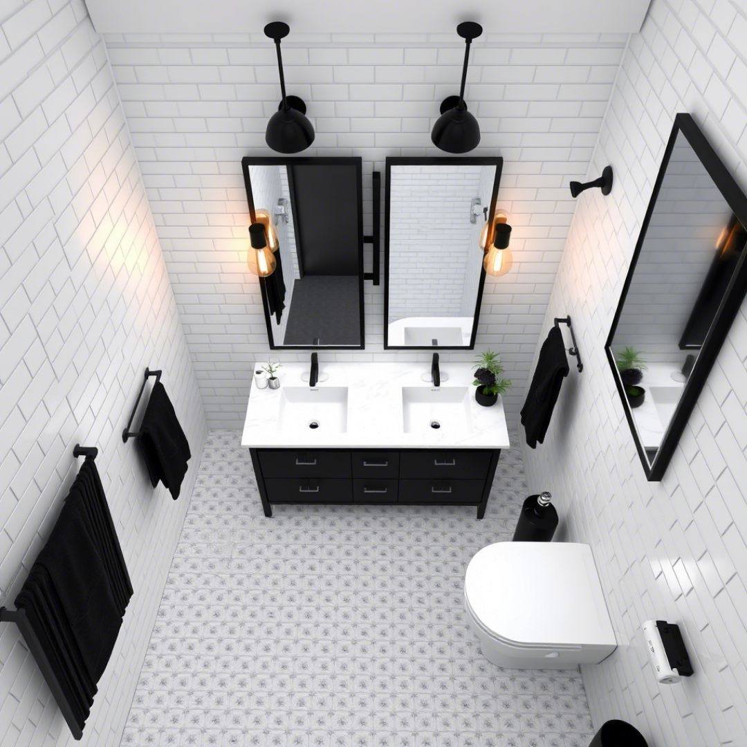 Sometimes less really does say more. This compact layout leans into clean lines and soft neutrals, letting the black fixtures quietly define the space without overwhelming it.