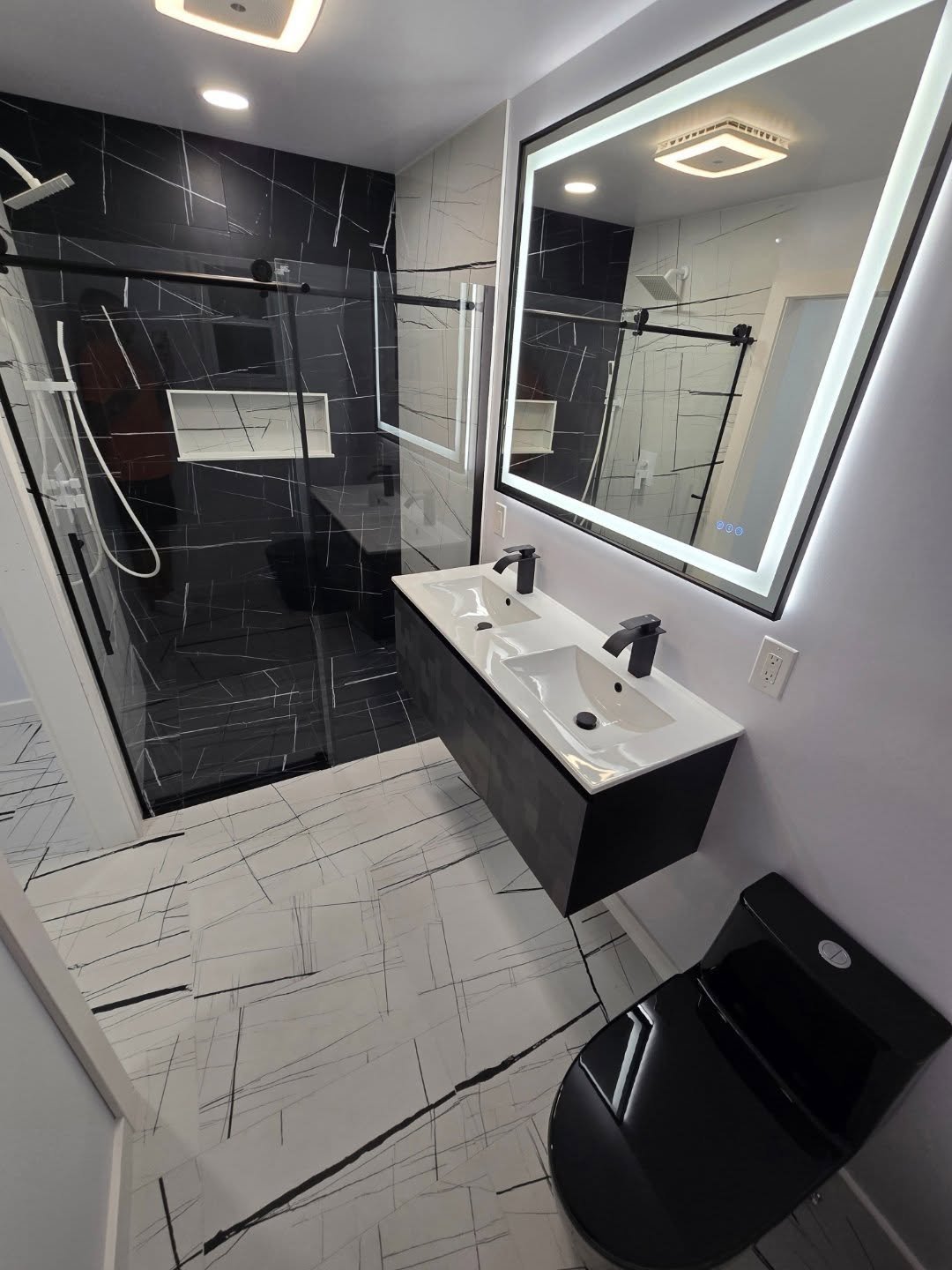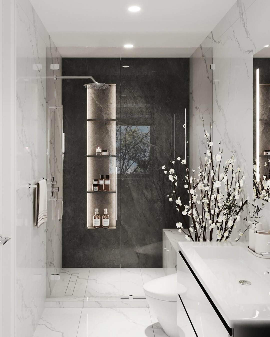 This space leans into brightness, letting white marble stretch across the room and reflect every bit of light. The black accents step in gently, defining edges without interrupting the calm.