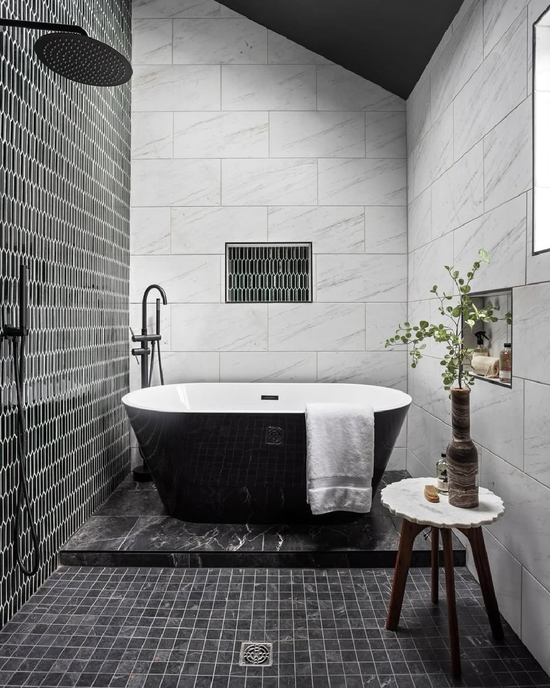 Then you notice the tub, soft curves against all that structure, and the greenery breathing life into the palette. It’s a reminder that even high contrast spaces need a little softness to feel complete.
