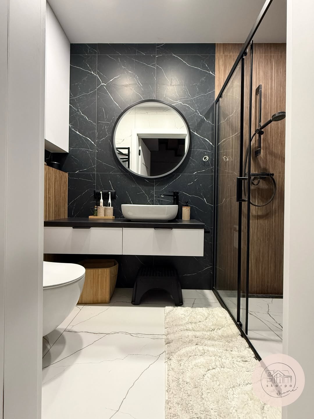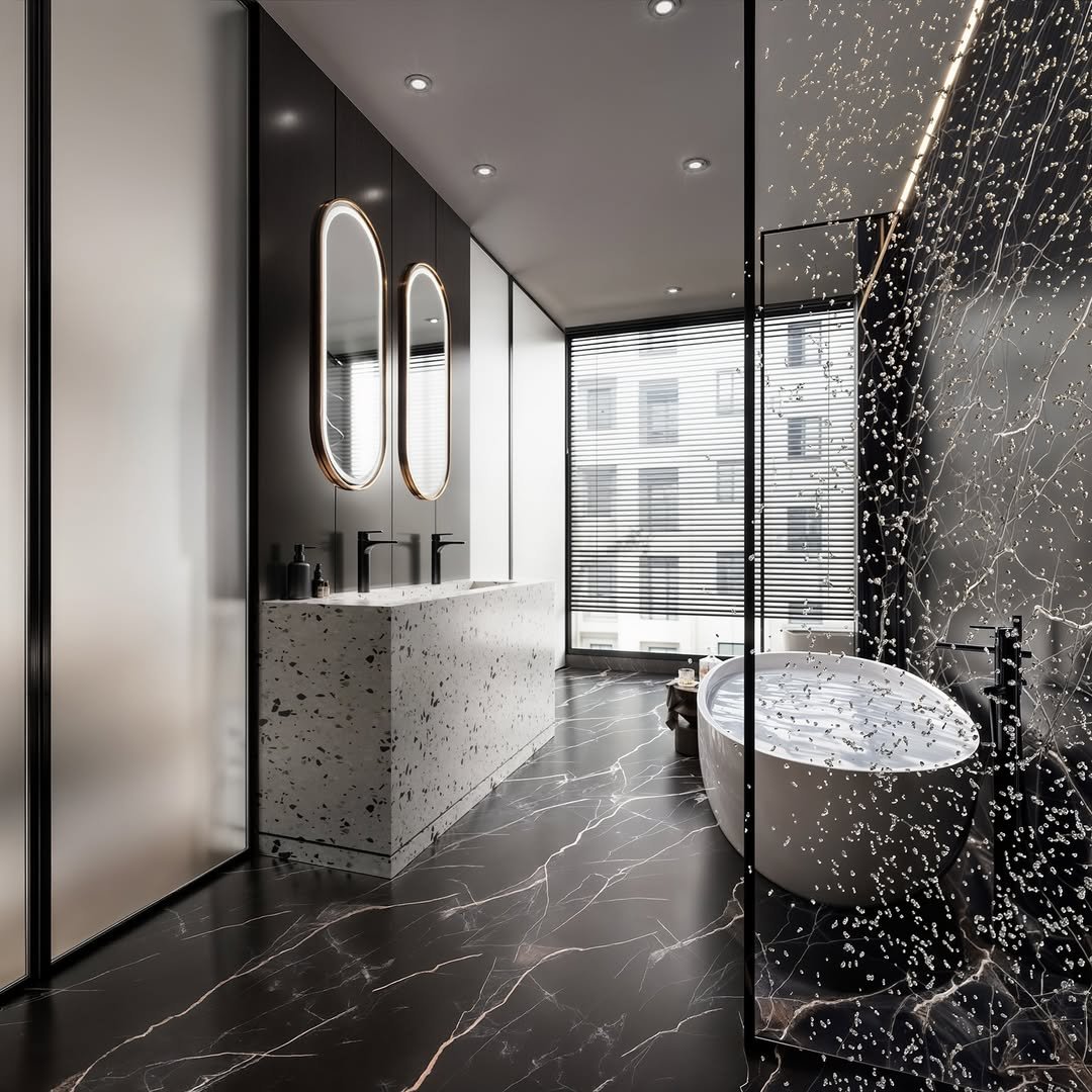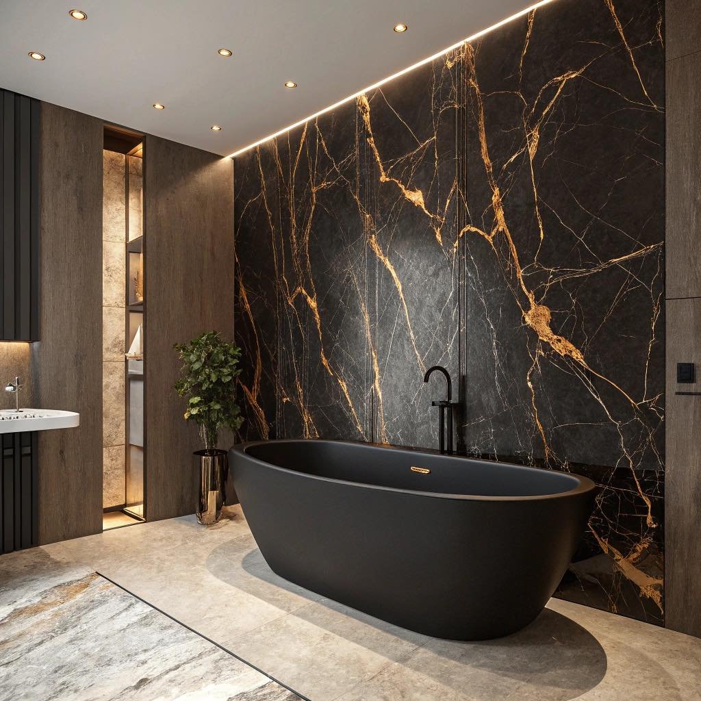 This one doesn’t whisper, it makes an entrance. The black marble wall with those bold veining lines feels almost like artwork, setting the tone for the entire room.