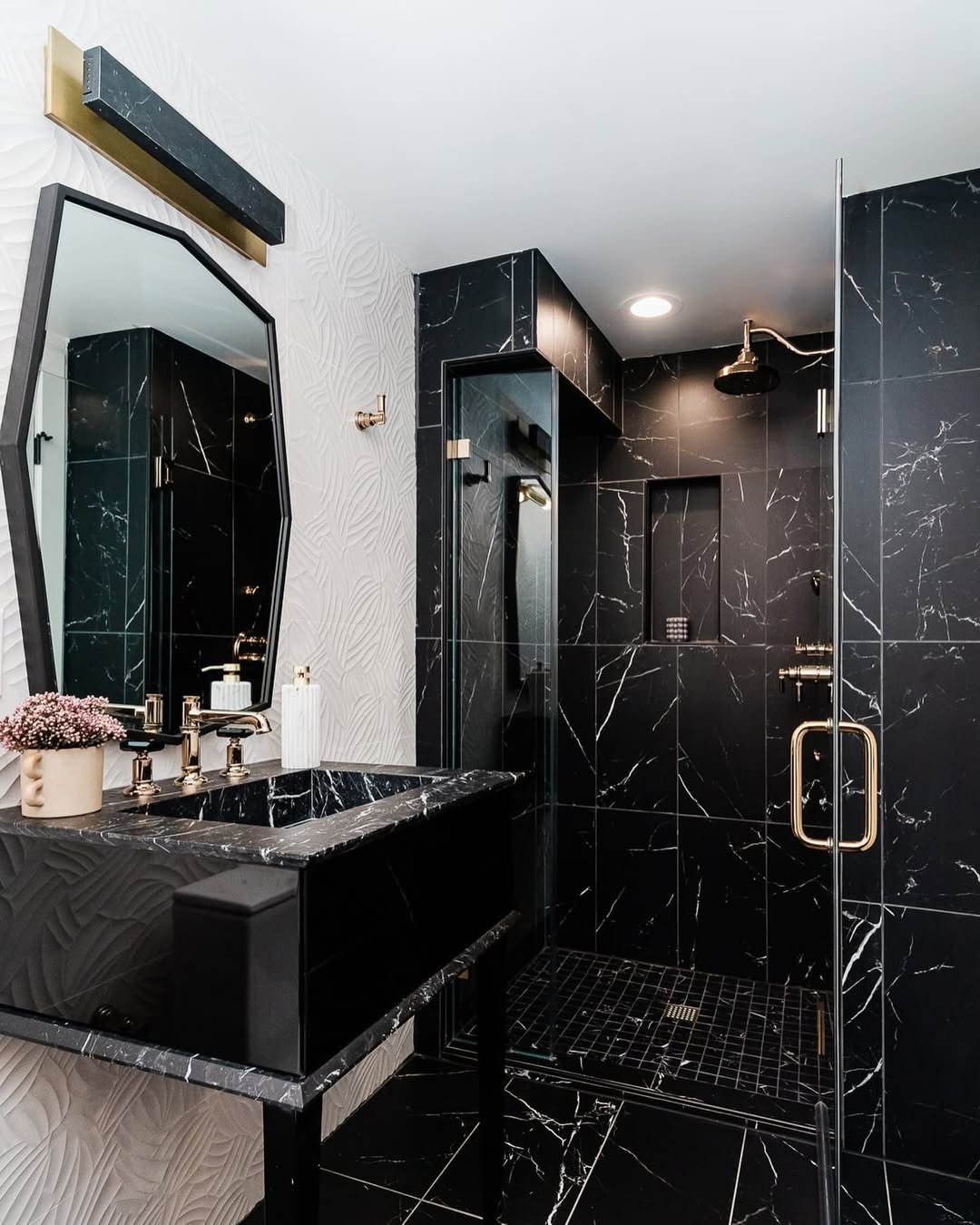 This space leans into full-on glamour, but in a way that feels tailored. Black marble wraps the room, veining catching the light, while brass fixtures add a warm glow against the dark backdrop.
