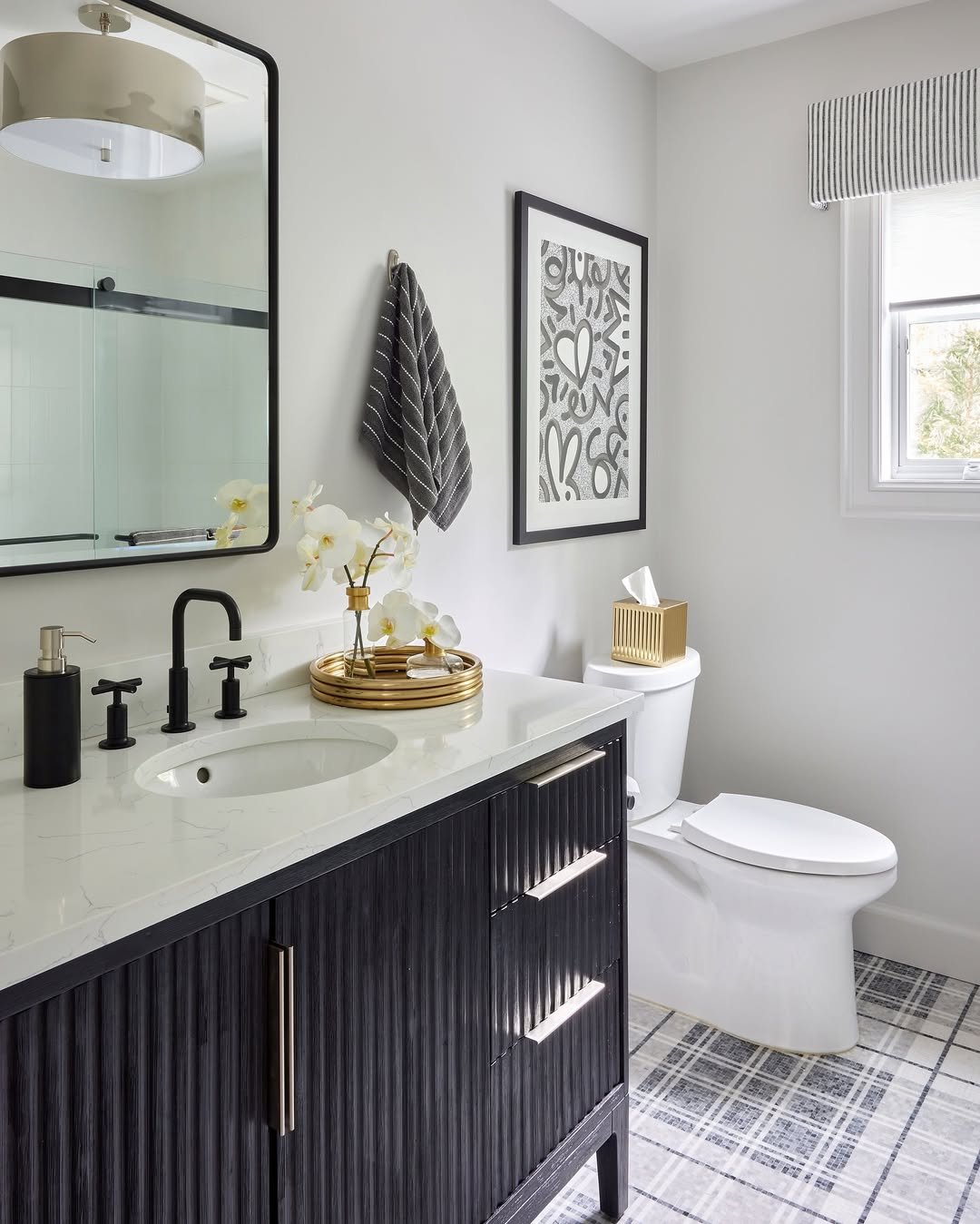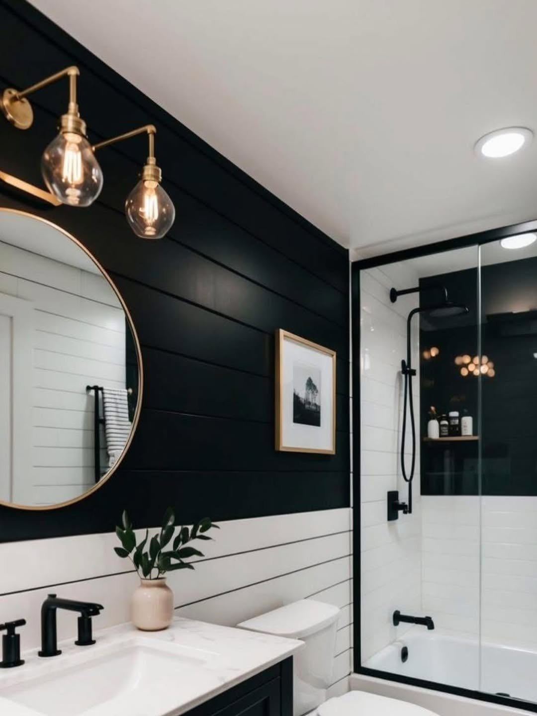 This one leans into a softer kind of contrast. The black vanity adds depth, while the lighter walls and countertop keep everything feeling fresh and approachable.