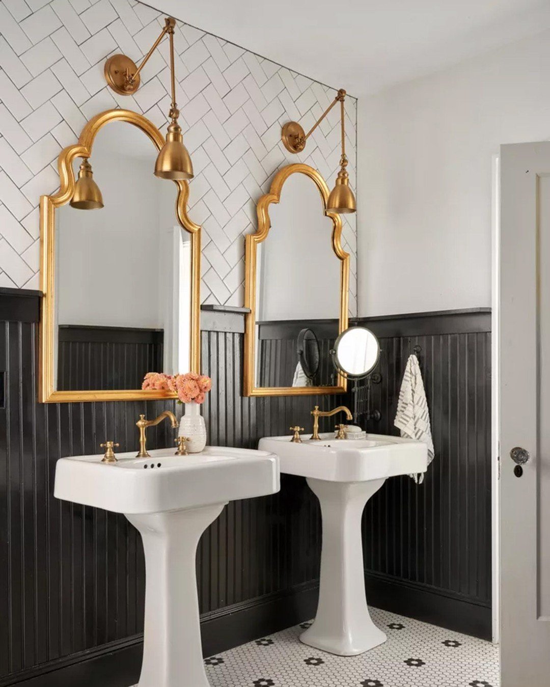There’s a vintage rhythm to this space that feels instantly charming. The pedestal sinks, the black paneling, and those gold mirrors bring a sense of old-world elegance with just enough polish.