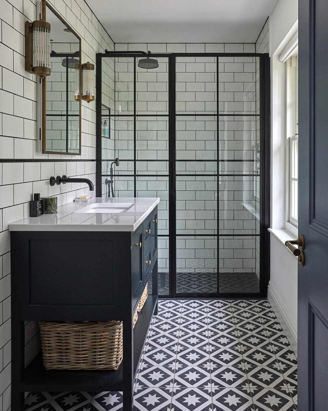 There’s a quiet confidence in this layout. Crisp white tiles, black grid framing, and a shower enclosure that feels structured but still open.