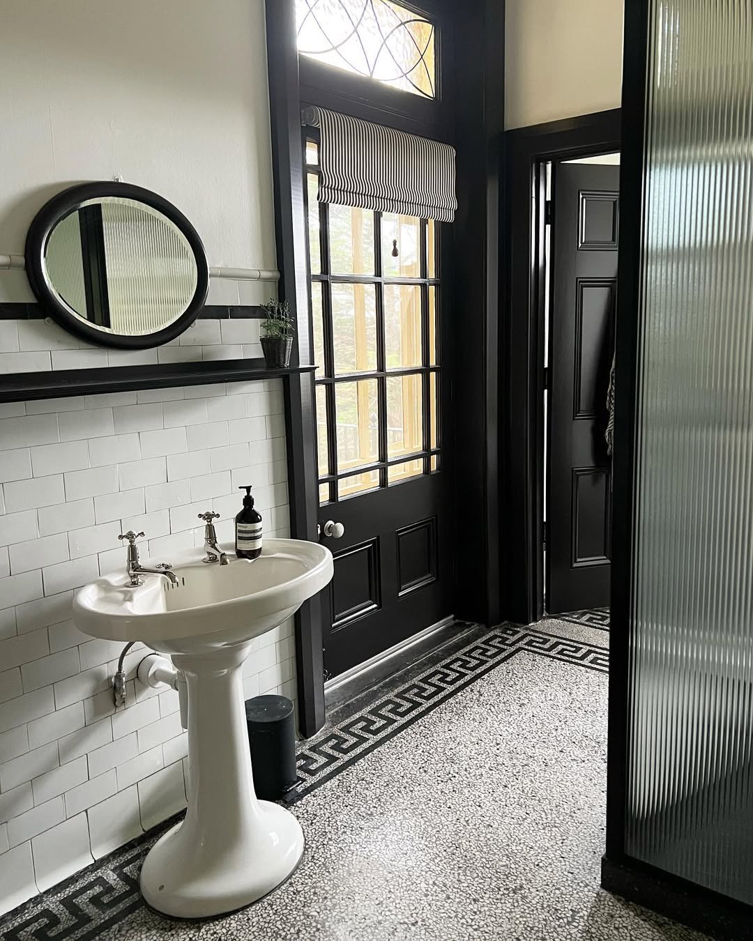 This feels like stepping into a European townhouse. The pedestal sink, the black trim, and that patterned border floor create a look that feels collected over time rather than designed all at once.