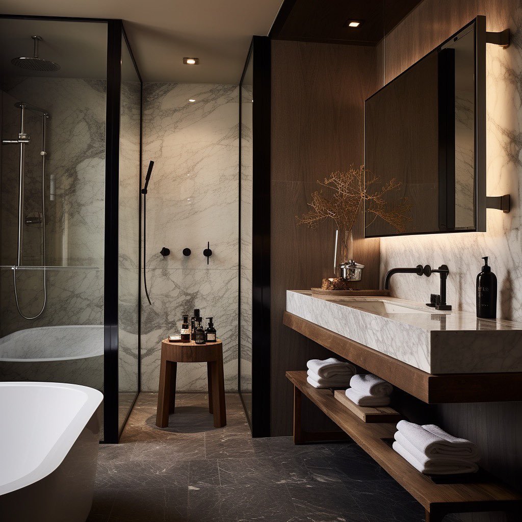 This space leans into calm in the best way. The mix of marble, wood, and soft lighting creates a layered look that feels both modern and grounded.