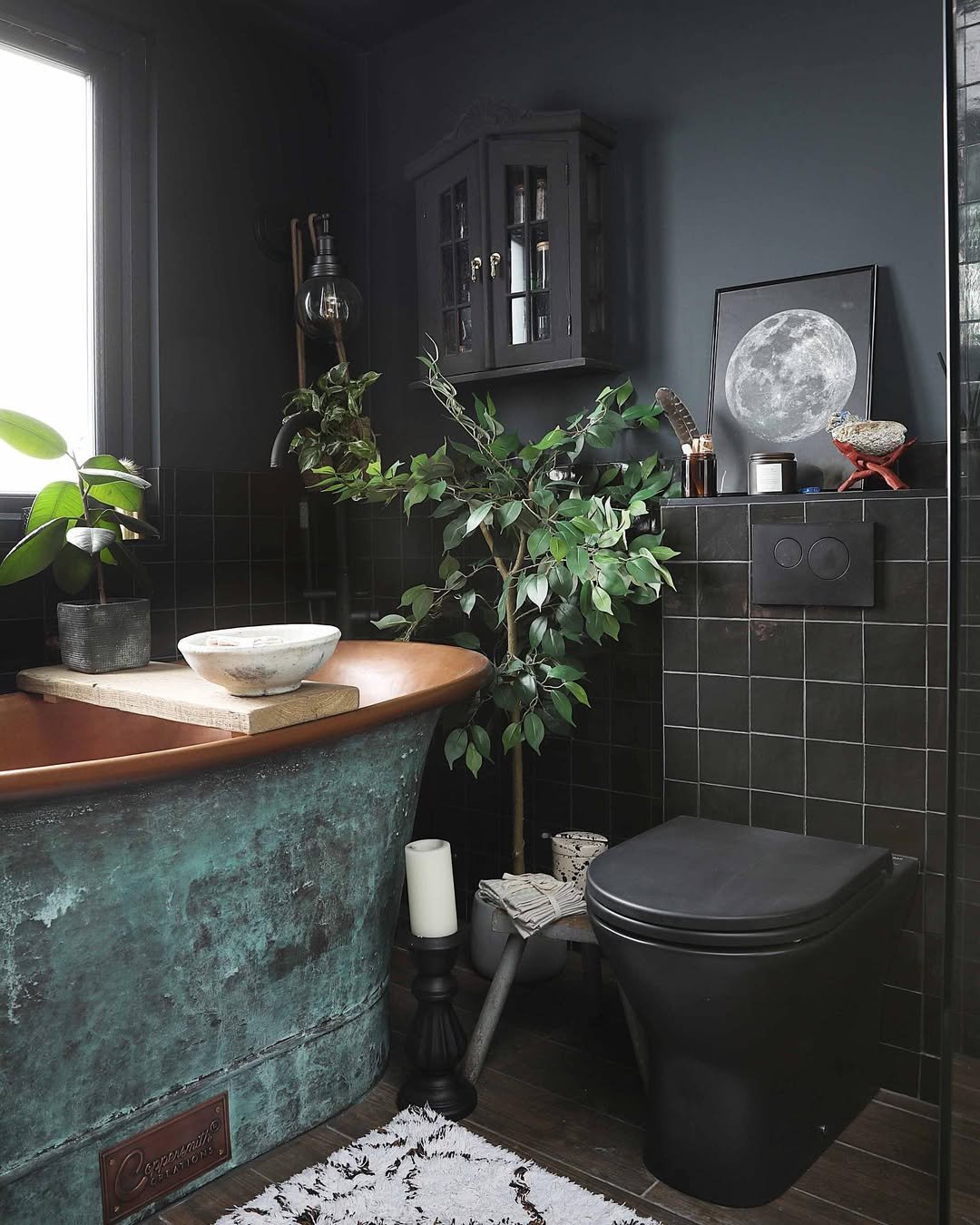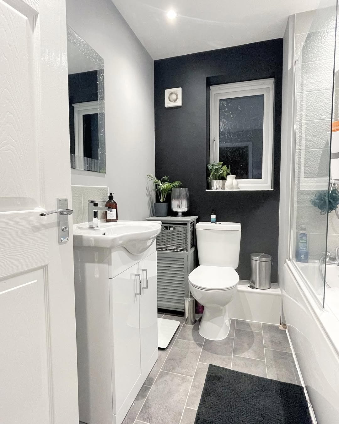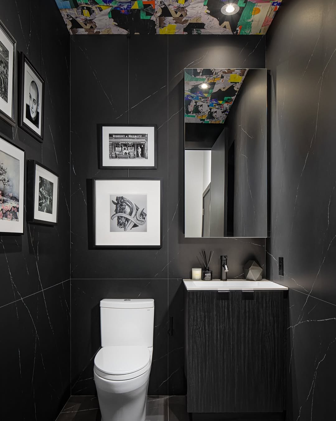 This one feels more like a styled corner than a bathroom. The framed artwork against those dark walls adds personality you don’t usually see in spaces like this.
