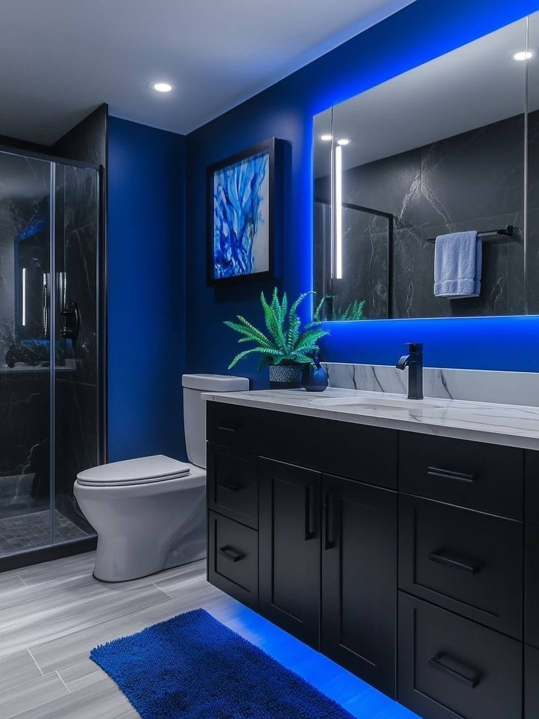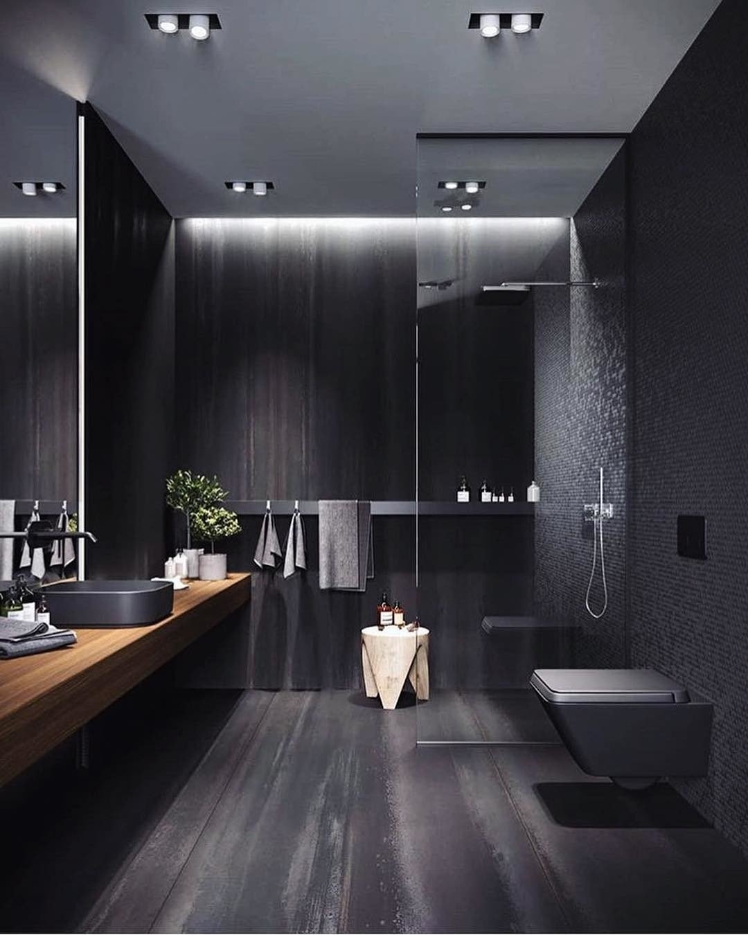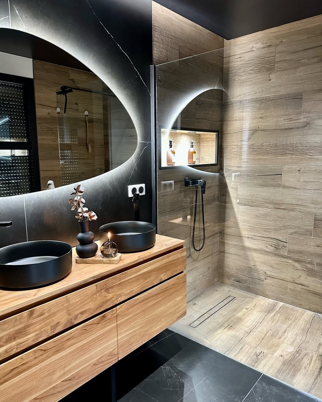 This one hits that perfect balance—dark, moody tones softened with warm wood and ambient lighting. The floating vanity and open shelving keep things airy, while still feeling grounded.