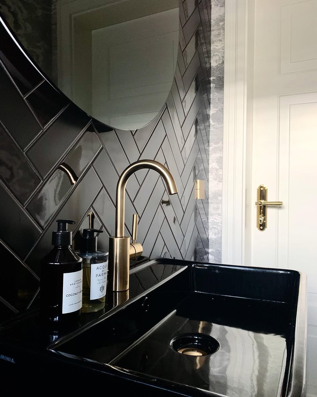 That glossy black sink paired with gold hardware? Instant upgrade. The shine alone brings so much depth, especially in a smaller space.