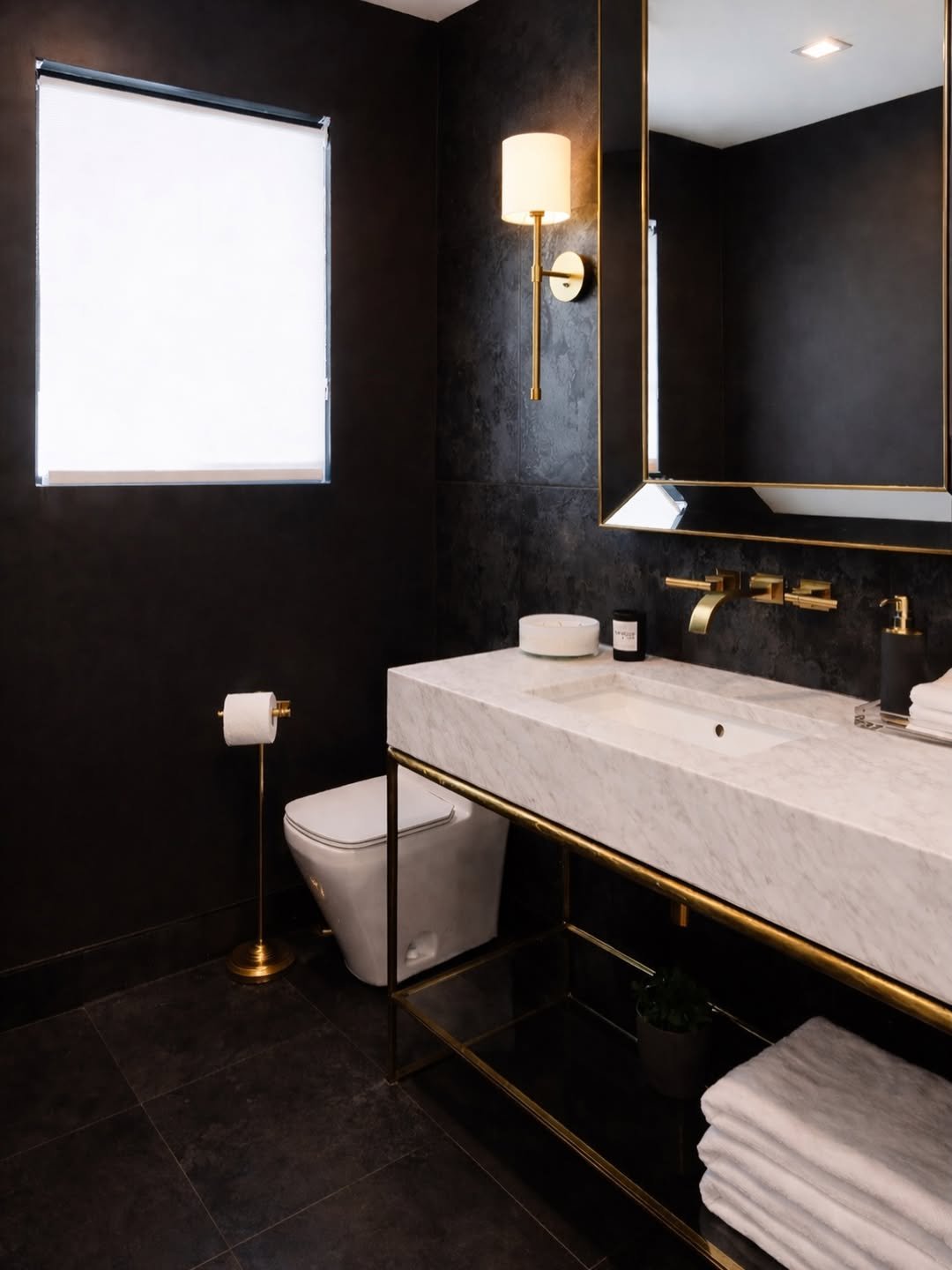 Black and gold never miss. The warm metallics against those deep walls create that high-end hotel vibe instantly.