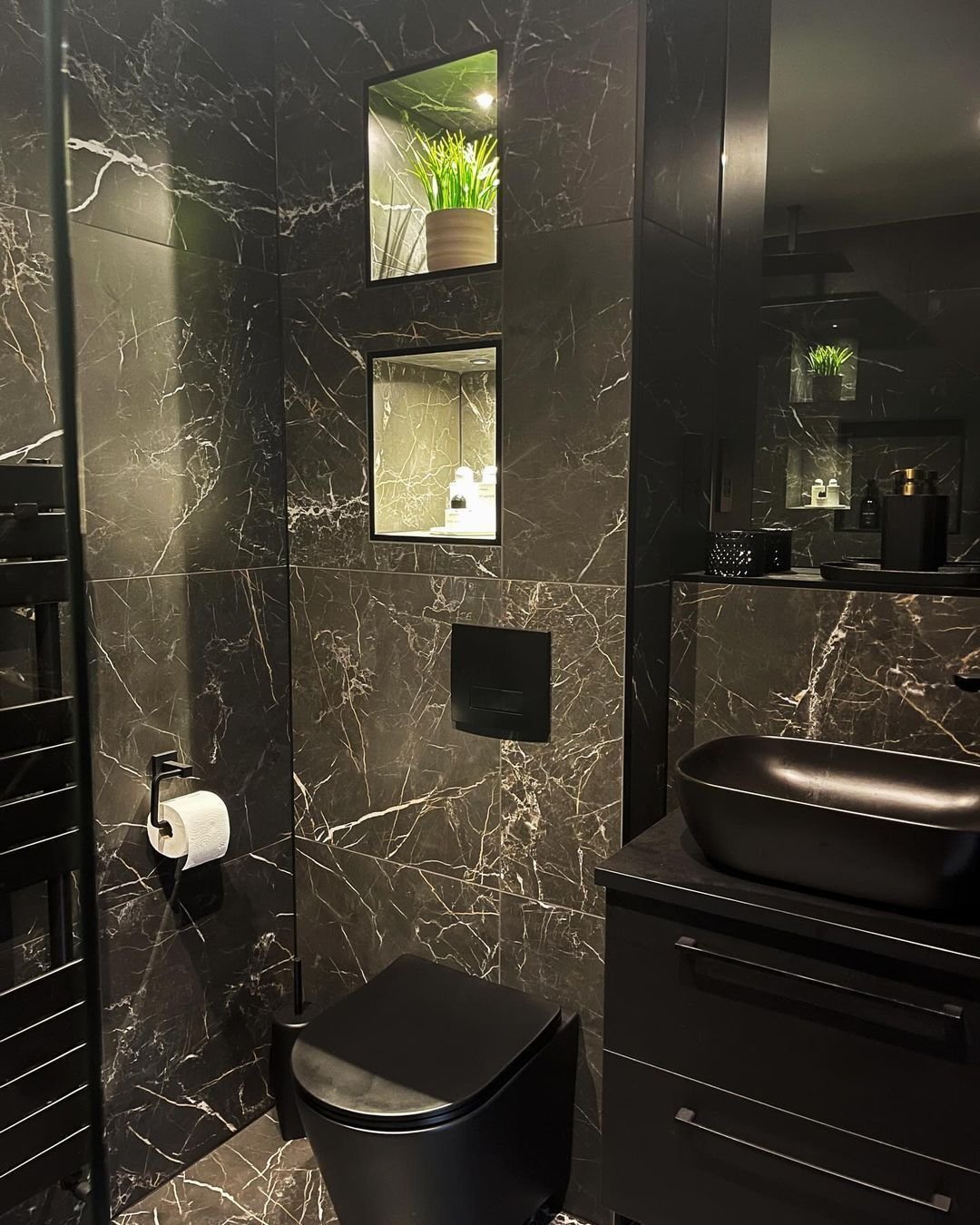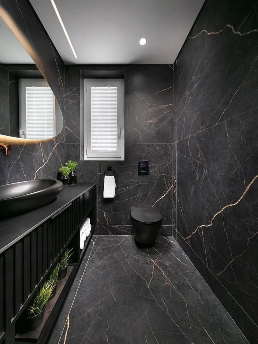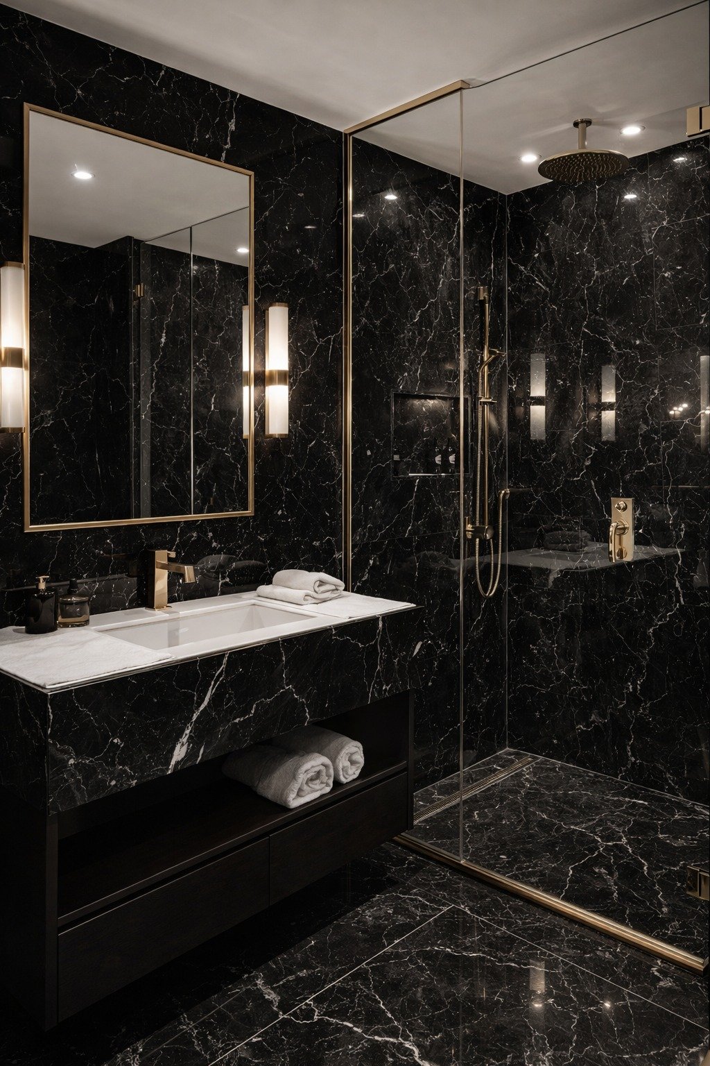 This is black marble done right—those delicate veins running across the walls and floor add just enough movement to keep things visually alive. It feels sleek, but not flat.