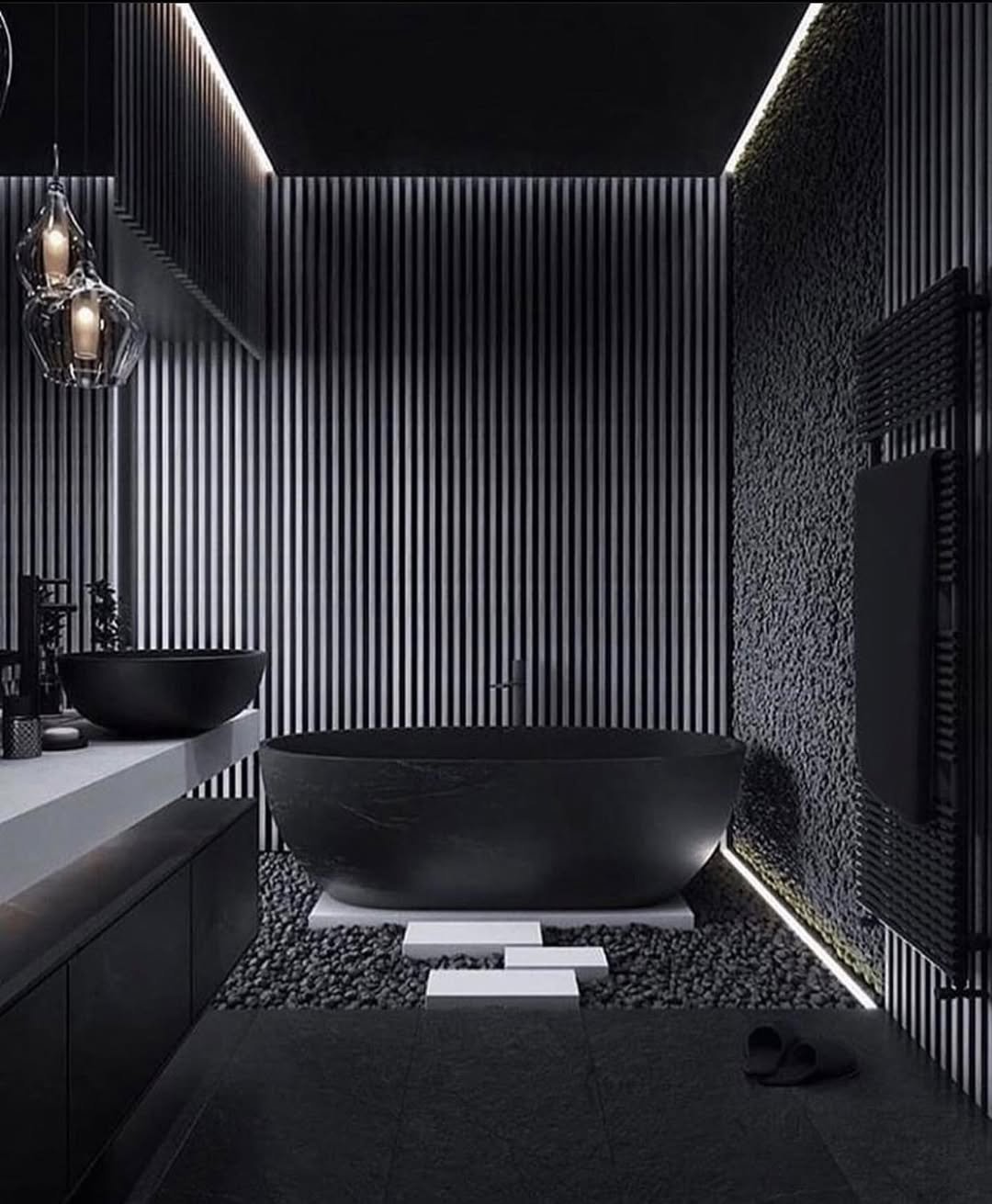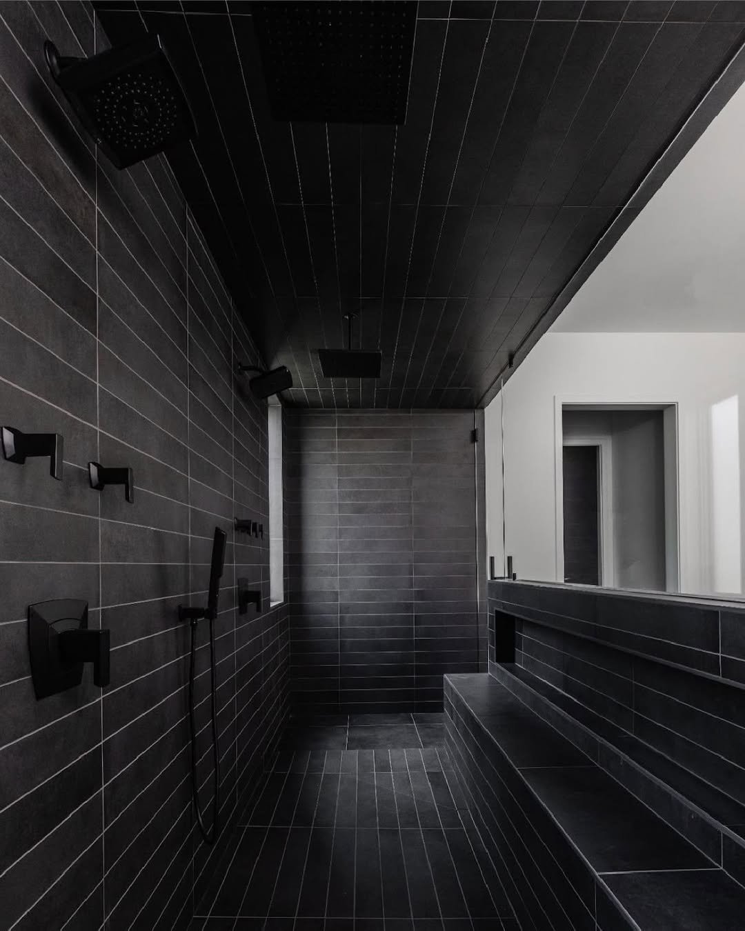 Here’s proof that black doesn’t have to feel heavy. The softer tones, paired with warm lighting and smooth textures, bring a calm, almost spa-like mood.