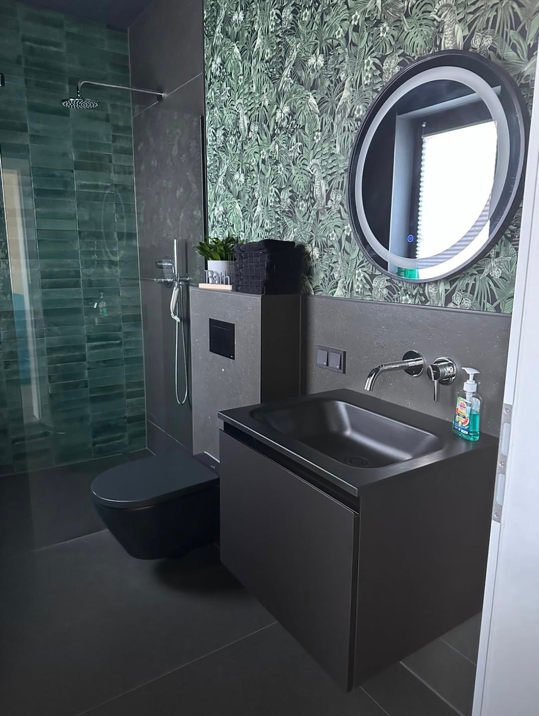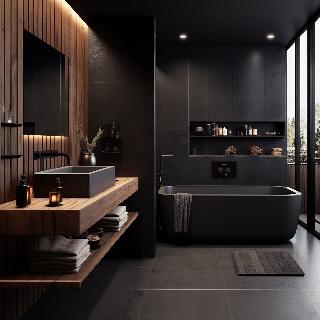 This space leans into calm. The dark tones, clean lines, and natural wood touches create a spa-like atmosphere that feels grounded and quiet.