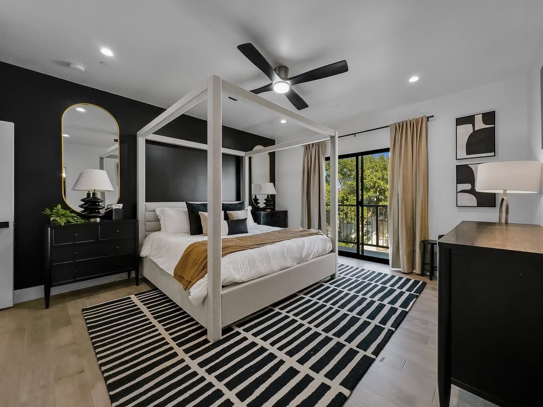 A lighter take that still leans into black in all the right places. The accent wall anchors the room, while the pale wood canopy bed keeps everything feeling open and breathable.