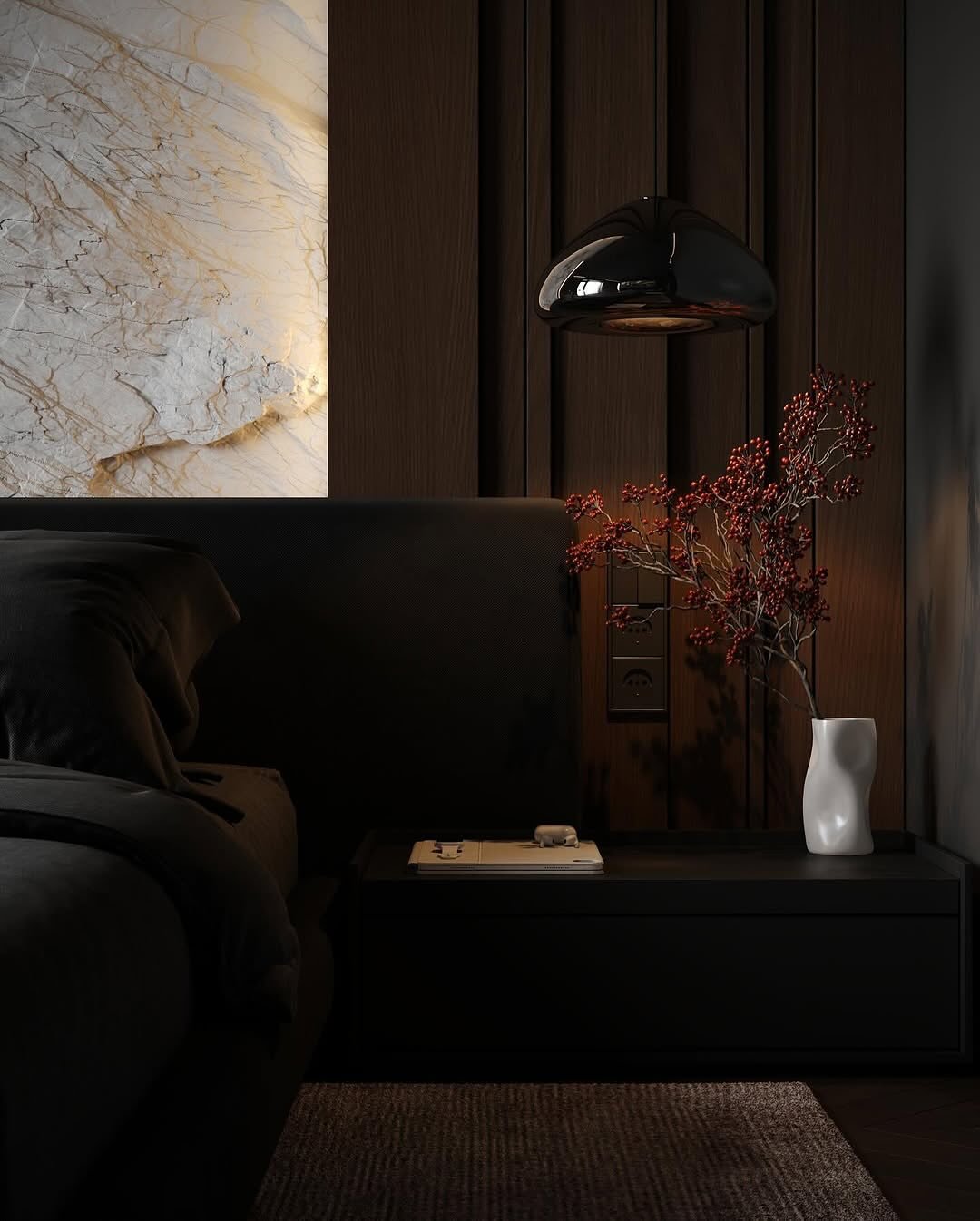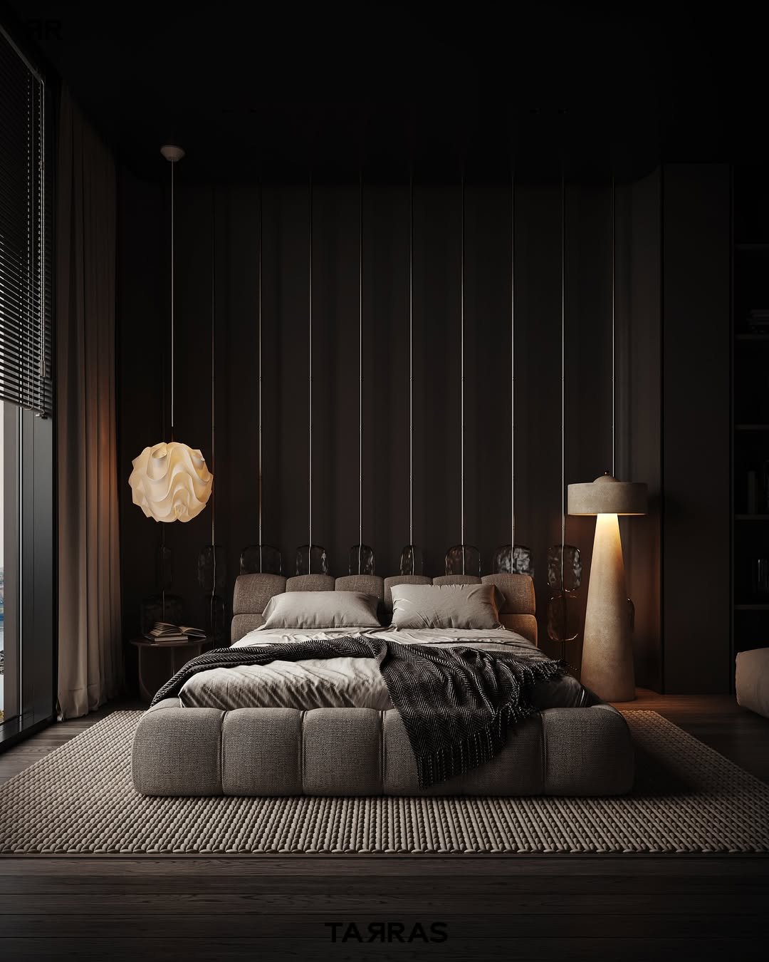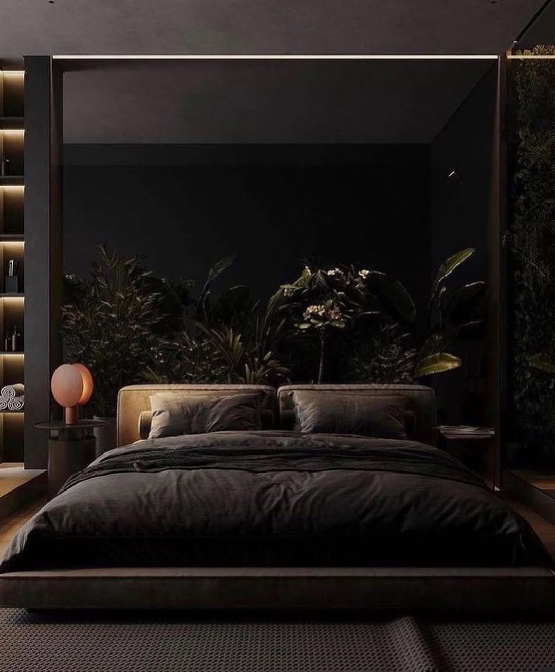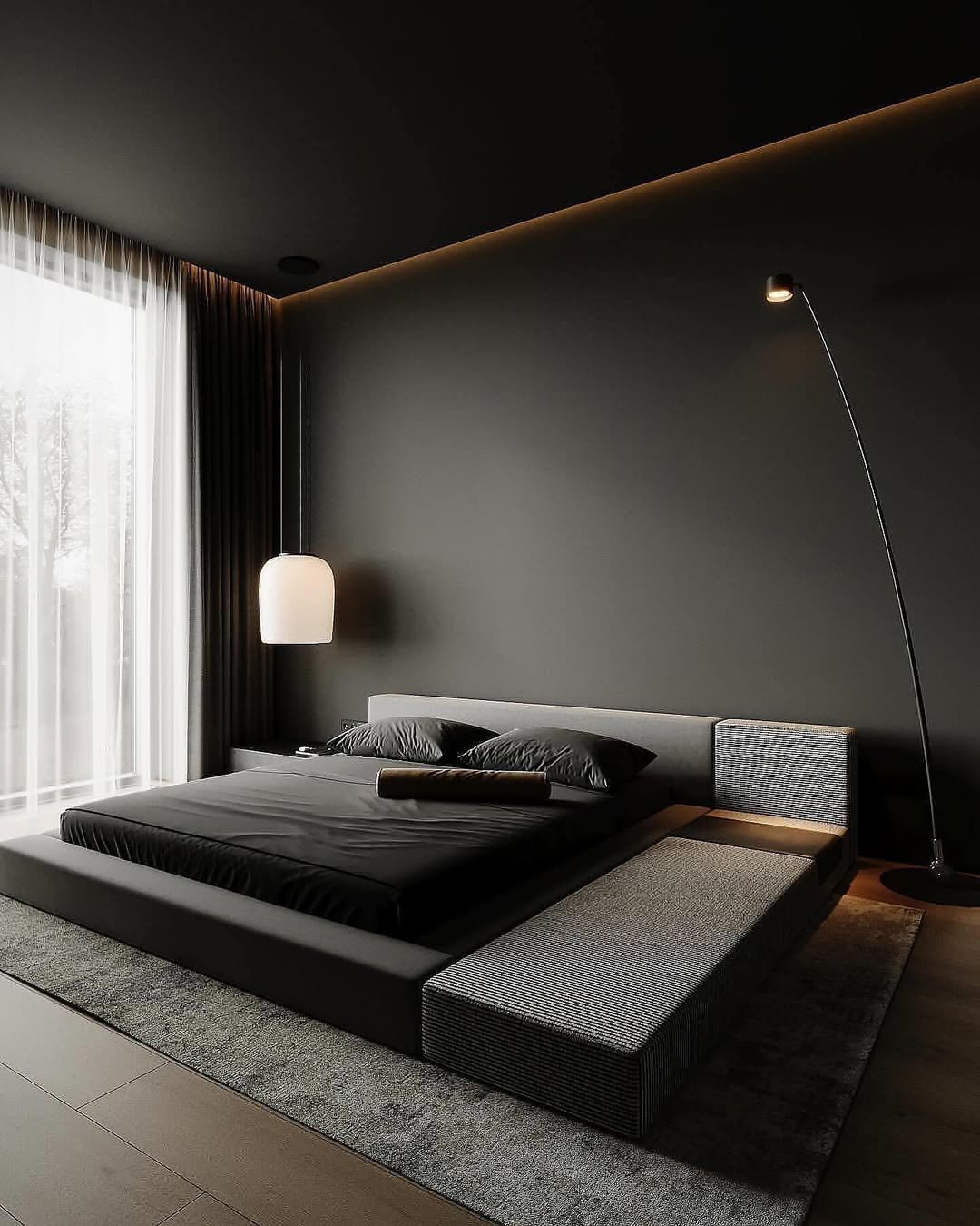 A softer take on dark interiors, where texture leads the story. That low, cushioned bed almost melts into the floor, while the curved pendant light adds a gentle sculptural moment.