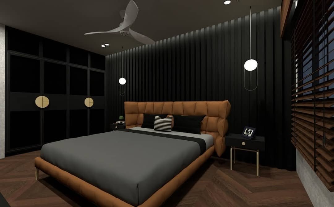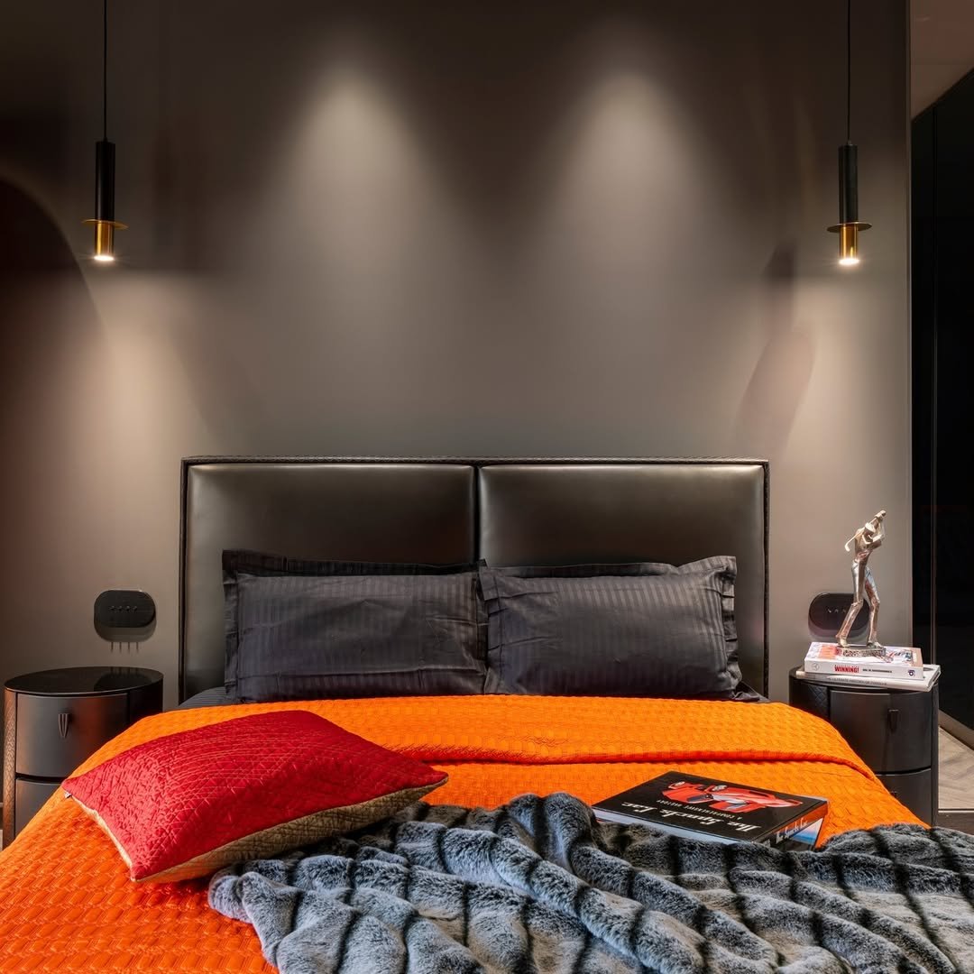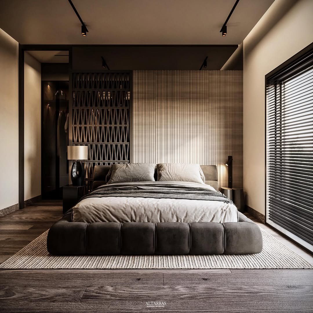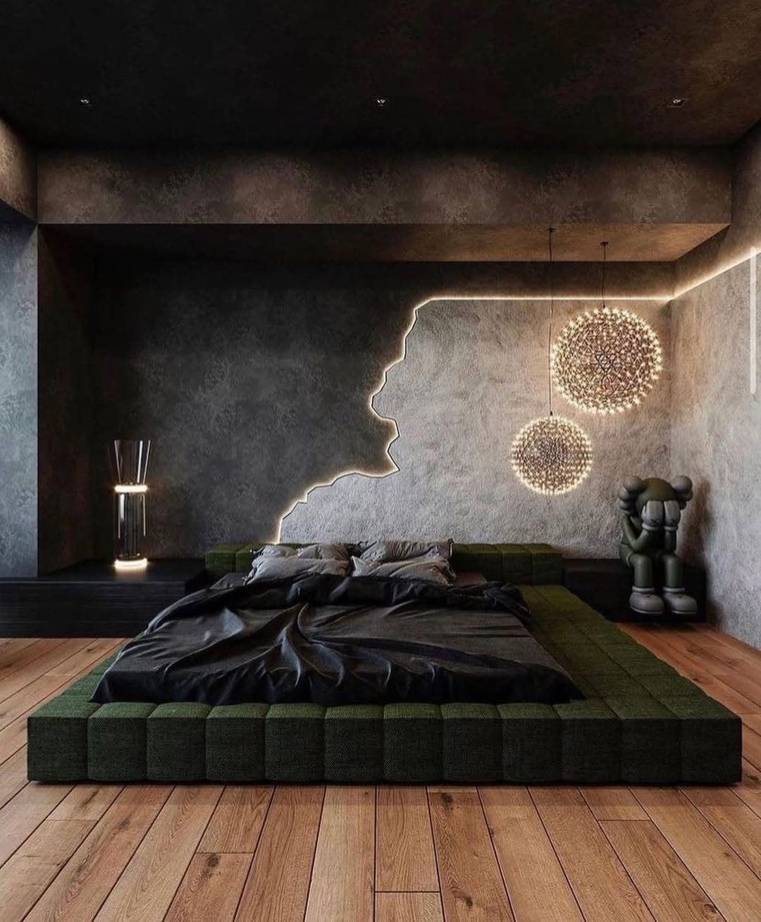 This one leans into creativity. Textured walls, sculptural lighting, and that low, platform bed give the room an almost gallery-like feel.