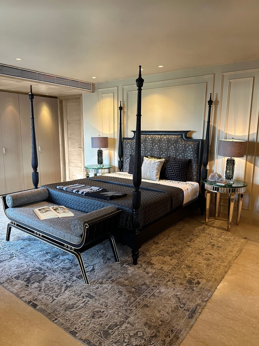 A more traditional take, but still rooted in that deep, moody palette. The four-poster bed becomes the focal point, framed by soft lighting and elegant detailing.