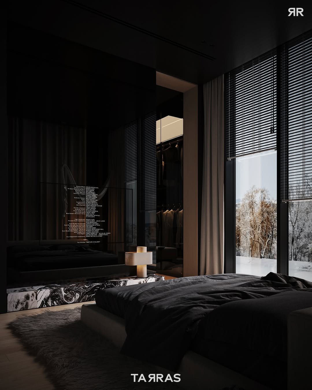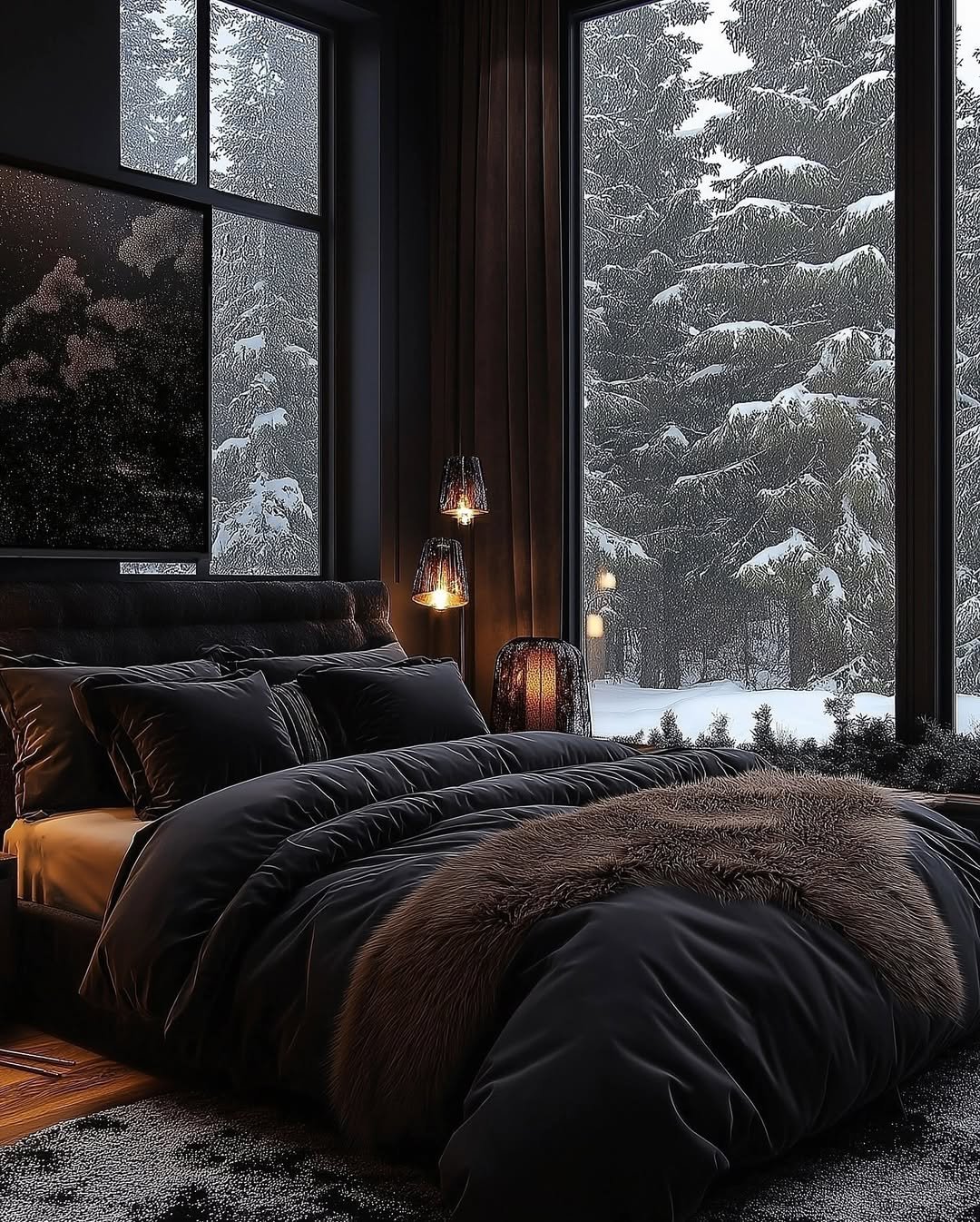 Dark interiors meet a snowy landscape outside, and the contrast is everything. Plush layers, deep bedding, and warm lighting turn the room into a cocoon against the cold.