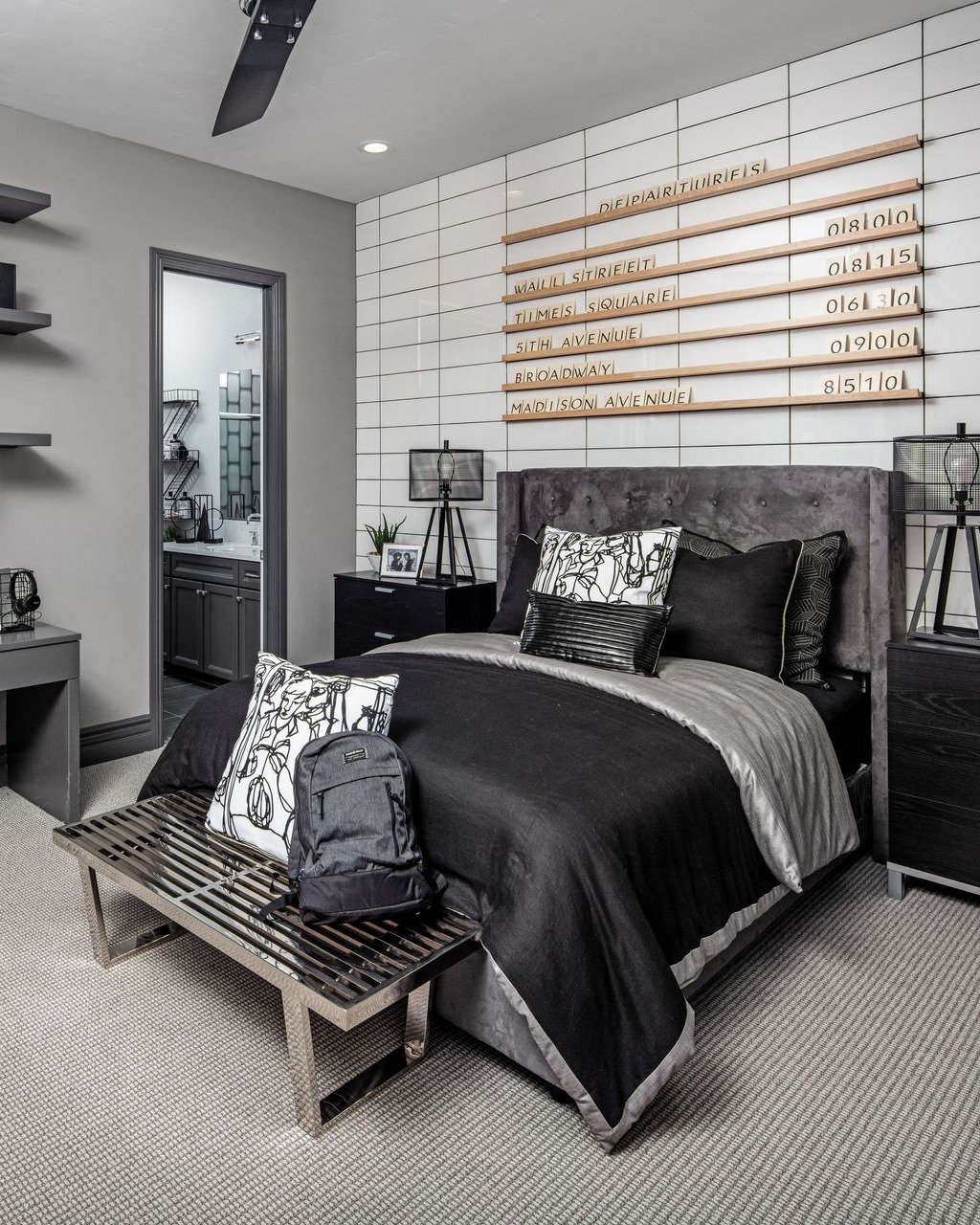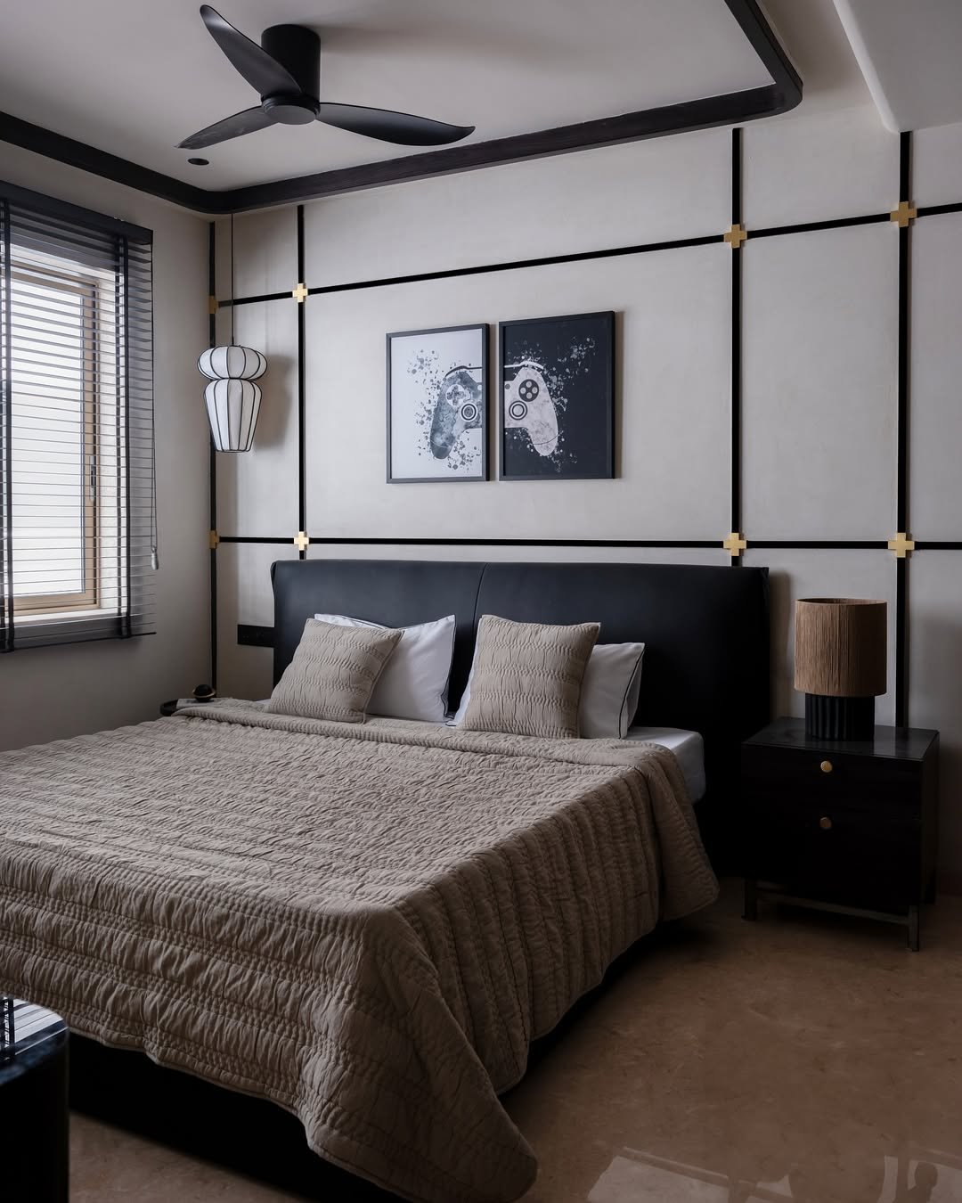 This room leans into a clean, city-inspired aesthetic. The grid wall detail gives it structure, while the mix of black, grey, and soft textiles keeps it from feeling too sharp.