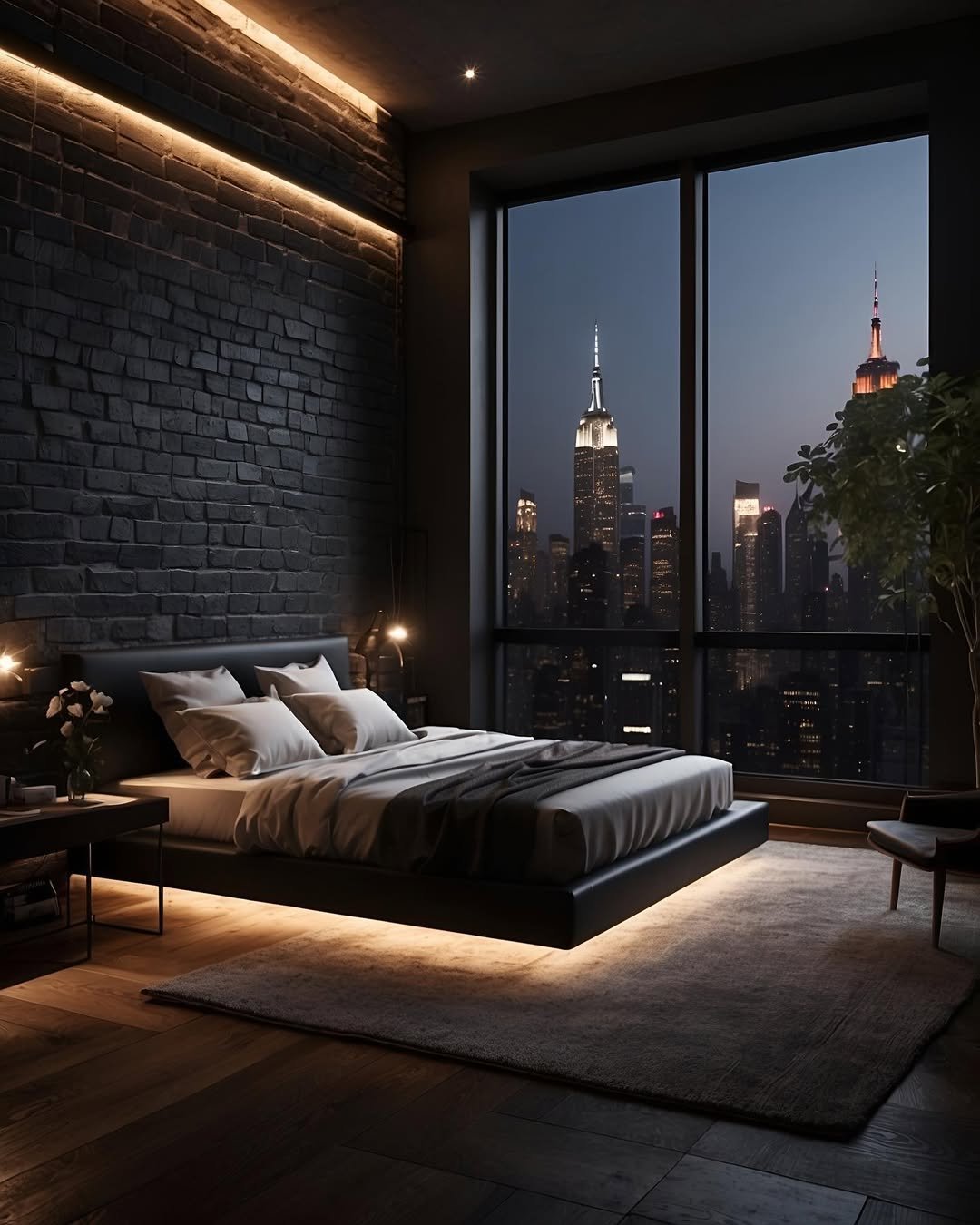 There’s something cinematic about this space, like the kind of bedroom you slip into after a long night out in the city. The black brick wall, the floating bed, and that skyline view lit up in the distance create a quiet kind of drama.