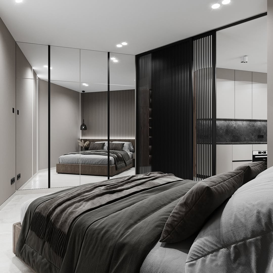 Clean lines, reflective panels, and a palette that stays within soft blacks and greys. The mirrored wardrobe expands the space without breaking the mood.