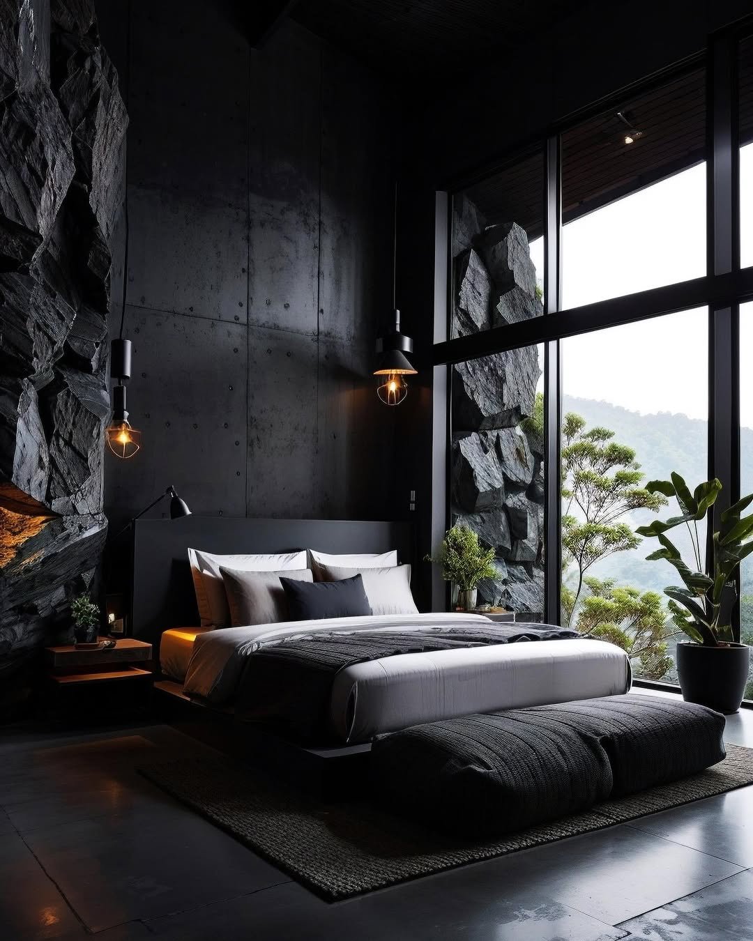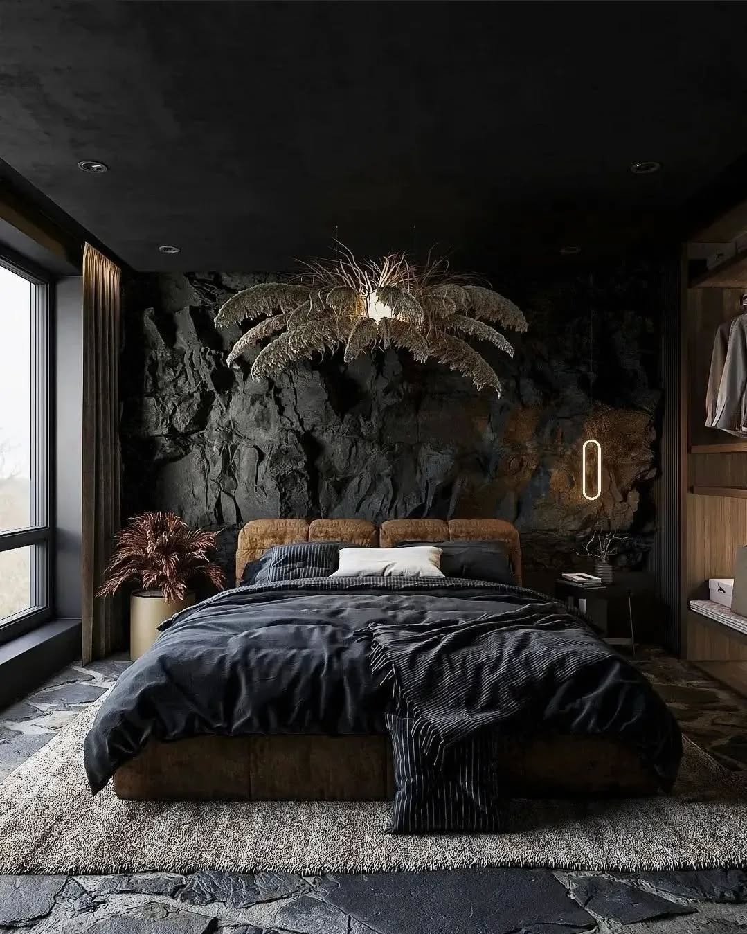 It’s the contrast that keeps it interesting. Soft bedding against rugged walls, warm bulbs against cool surfaces. If you’re leaning into black, mix textures like this so the room feels rich, not flat.