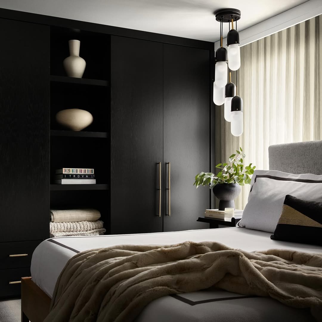 This room proves black can still feel bright. The paneled wall adds structure, while the light bedding and layered textures soften the overall look.