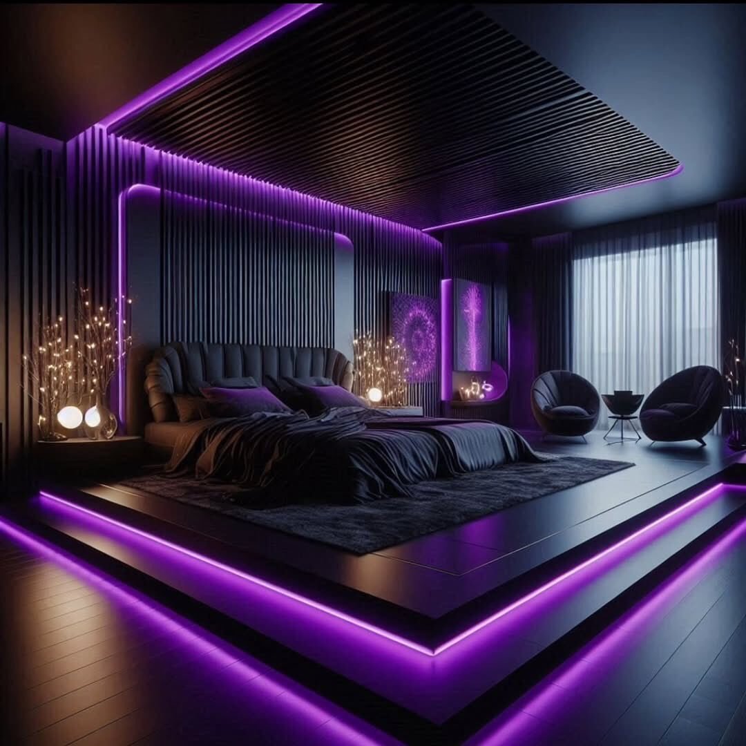 A little unexpected, but it works. Purple LED accents slice through the black, giving the room a futuristic, almost lounge-like energy.